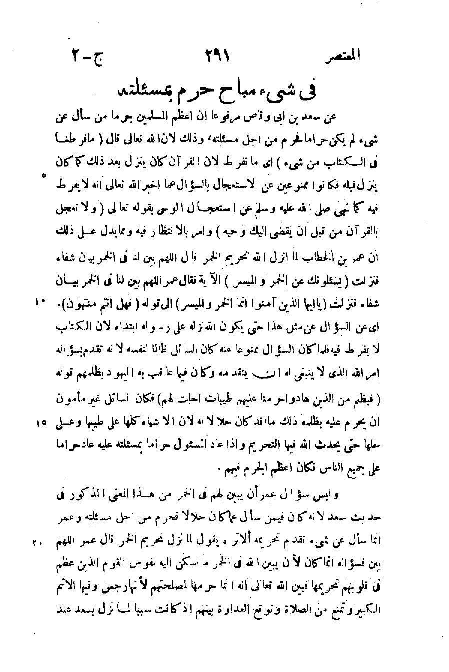 عن سعد بن أبي وقاص مرفوعا "أن أعظم المسلمين جرما من سأل عن شيء لم يكن حراما فحرم من أجل مسألته" وذلك لأن الله تعالى قال: {مَا فَرَّطْنَا فِي الْكِتَابِ مِنْ شَيْءٍ} أي: ما نفرط لأن القرآن كان ينزل بعد ذلك كما كان ينزل قبله فكانوا ممنوعين عن الاستعجال بالسؤال عما أخبر الله تعالى أنه لا يفرط فيه كما نهى صلى الله عليه وسلم عن استعجال الوحي بقوله تعالى: {وَلا تَعْجَلْ بِالْقُرْآنِ مِنْ قَبْلِ أَنْ يُقْضَى إِلَيْكَ وَحْيُهُ} وأمر بالانتظار فيه ومما يدل على ذلك أن عمر بن الخطاب لما أنزل الله تحريم الخمر قال: اللهم بين لنا في الخمر بيان شفاء فنزلت: {يَسْأَلونَكَ عَنِ الْخَمْرِ وَالْمَيْسِرِ} الآية فقال عمر: اللهم بين لنا في الخمر بيان شفاء فنزلت: {يَا أَيُّهَا الَّذِينَ آمَنُوا إِنَّمَا الْخَمْرُ وَالْمَيْسِرُ} إلى قوله: {فَهَلْ أَنْتُمْ مُنْتَهُونَ} . أي: عن السؤال عن مثل هذا حتى يكون الله نزله على رسوله ابتداء لأن الكتاب لا يفرط فيه فلما كان السؤال ممنوعا عنه كان السائل ظالما لنفسه لأنه تقدم بسؤاله أمر الله الذي لا ينبغي له أن يتقدمه وكان فيما عاقب به اليهود بظلمهم قوله: {فَبِظُلْمٍ مِنَ الَّذِينَ هَادُوا حَرَّمْنَا عَلَيْهِمْ طَيِّبَاتٍ أُحِلَّتْ لَهُمْ} فكان السائل غير مأمون أن يحرم عليه بظلمه ذلك ما قد كان حلالا له لأن الأشياء كلها على طيبها وعلى حلها حتى يحدث الله فيها التحريم وإذا عاد المسؤول حراما بمسألته عليه عاد حراما على جميع الناس فكان أعظم الجرم فيهم.