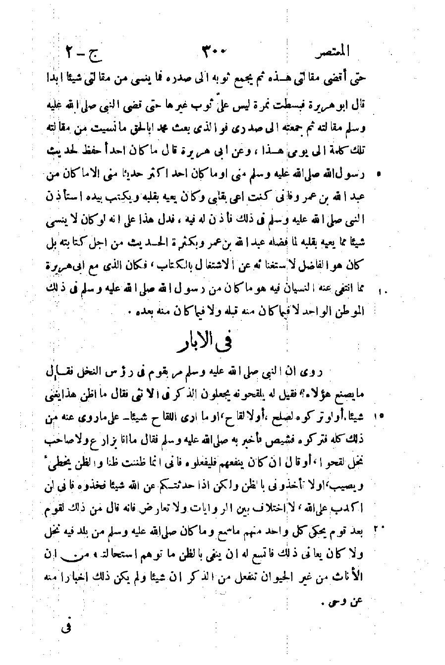 روي أن النبي صلى الله عليه وسلم مر بقوم في رؤوس النخل فقال: "ما يصنع هؤلاء"؟ فقيل له: يلقحونه يجعلون الذكر في الأنثى فقال: "ما أظن هذا يغني شيئا"، أو لو تركوه لصلح، أو لا لقاح، أو ما أرى اللقاح شيئا- على ما روي عنه من ذلك كله فتركوه فشيص فأخبر به صلى الله عليه وسلم فقال: "ما أنا بزارع ولا صاحب نخل لقحوا"، أو قال: "إن كان ينفعهم فليفعلوه فإني إنما ظننت ظنا والظن يخطئ ويصيب، أو لا تأخذوني بالظن ولكن إذا حدثتكم عن الله شيئا فخذوه فإني لن أكذب على الله"، لا اختلاف بين الروايات ولا تعارض فإنه قال من ذلك لقوم بعد قوم يحكى كل واحد منهم ما سمع وما كان صلى الله عليه وسلم من بلد فيه نخل ولا كان يعاني ذلك فاتسع له أن ينفي بالظن ما توهم استحالته من أن الإناث من غير الحيوان تنفعل من الذكر أن شيئا ولم يكن ذلك أخبارا منه عن وحي.