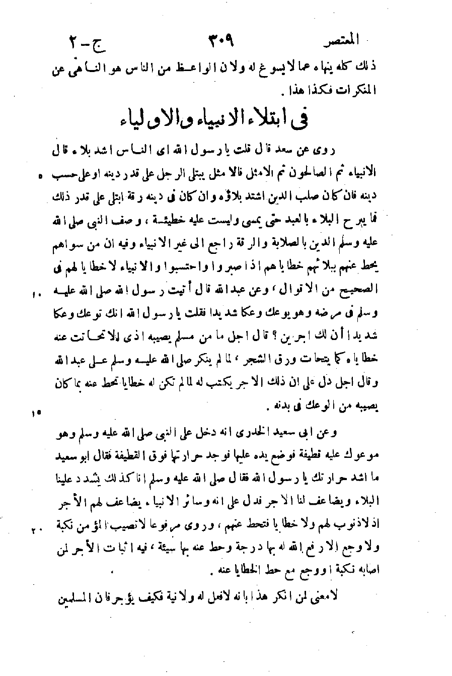روى عن سعد قال: قلت: يا رسول الله أي الناس أشد بلاء؟ قال: "الأنبياء ثم الصالحون ثم الأمثل فالأمثل يبتلى الرجل على قدر دينه أو على حسب دينه فإن كان صلب الدين اشتد بلاؤه وإن كان في دينه رقة ابتلى على قدر ذلك فما يبرح البلاء بالعبد حتى يمسي وليست عليه خطيئة"، وصف النبي صلى الله عليه وسلم الدين بالصلابة والرقة راجع إلى غير الأنبياء وفيه أن من سواهم يحط عنهم ببلائهم خطاياهم إذا صبروا واحتسبوا والأنبياء لا خطايا لهم في الصحيح من الأقوال، وعن عبد الله قال: أتيت رسول الله صلى الله عليه وسلم في مرضه وهو يوعك وعكا شديدا فقلت: يا رسول الله إنك توعك وعكا شديدا أن لك أجرين؟ قال: "أجل ما من مسلم يصيبه أذى إلا تحاتت عنه خطاياه كما يتحات ورق الشجر"، لما لم ينكر صلى الله عليه وسلم على عبد الله وقال: "أجل" دل على أن ذلك الأجر يكتب له لما لم تكن له خطايا تحط عنه بما كان يصيبه من الوعك في بدنه.