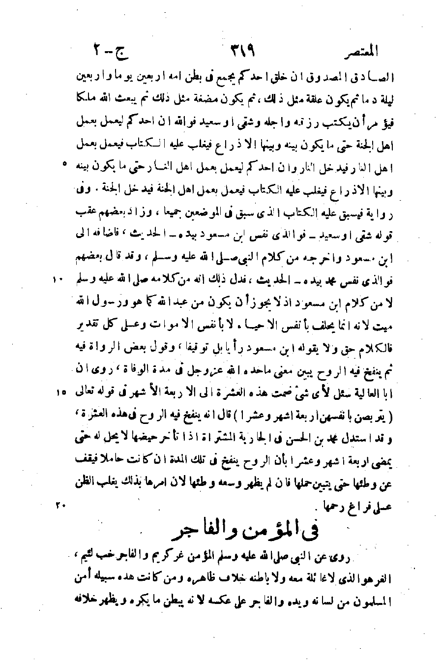 الصادق المصدوق "إن خلق أحدكم يجمع في بطن أمه أربعين يوما وأربعين ليلة دما ثم يكون علقة مثل ذلك ثم يكون مضغة مثل ذلك ثم يبعث الله ملكا فيؤمر أن يكتب رزقه وأجله وشقي أو سعيد فوالله إن أحدكم ليعمل بعمل أهل الجنة حتى ما يكون بينه وبينها إلا ذراع فيغلب عليه الكتاب فيعمل بعمل أهل النار فيدخل النار وإن أحدكم ليعمل بعمل أهل النار حتى ما يكون بينه وبينها إلا ذراع فيغلب عليه الكتاب فيعمل بعمل أهل الجنة فيدخل الجنة" وفي رواية فيسبق عليه الكتاب الذي سبق في الموضعين جميعا وزاد بعضهم عقب قوله: شقي أو سعيد فوالذي نفس ابن مسعود بيده الحديث فأضافه إلى ابن مسعودوأخرجه من كلام النبي صلى الله عليه وسلم وقد قال بعضهم: فوالذي نفس محمد بيده الحديث فدل ذلك أنه من كلامه صلى الله عليه وسلم لا من كلام ابن مسعود إذ لا يجوز أن يكون من عبد الله كما هو ورسول الله ميت لأنه إنما يحلف بأنفس الإحياء لا بأنفس الأموات وعلى كل تقدير فالكلام حق ولا يقوله ابن مسعود رأيا بل توقيفا وقول بعض الرواة فيه ثم ينفخ فيه الروح يبين معنى ما حده الله عز وجل في مدة الوفاة روي أن أبا العالية سئل لأي شيء ضمت هذه العشرة إلى الأربعة الأشهر في قوله تعالى: {يَتَرَبَّصْنَ بِأَنْفُسِهِنَّ أَرْبَعَةَ أَشْهُرٍ وَعَشْراً} قال: أنه ينفخ فيه الروح في هذه العشرة وقد استدل محمد بن الحسن في الجارية المشتراة إذا تأخر حيضها لا يحل له حتى يمضي أربعة أشهر وعشرا بأن الروح ينفخ في تلك المدة إن كانت حاملا فيقف عن وطئها حتى يتبين حملها فإن لم يظهر وسعه وطئها لأن أمرها بذلك يغلب الظن على فراغ رحمها.