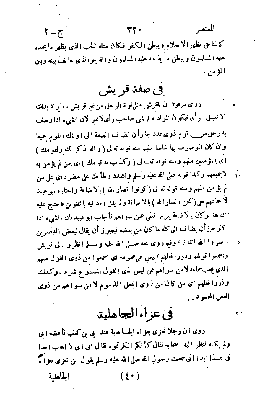 روي مرفوعا أن للقرشي مثلي قوة الرجل من غير قريش ما يراد بذلك إلا تنبيل الرأي فيكون المراد به قرشي صاحب رأي لا غير لأن الشيء إذا وصف به رجل من قوم ذوي عدد جاز أن تضاف الصفة إلى أولئك القوم جميعا وإن كان الموصوف بها خاصا منهم منه قوله تعالى: {وَإِنَّهُ لَذِكْرٌ لَكَ وَلِقَوْمِكَ} أي: المؤمنين منهم ومنه قوله تعالى: {وَكَذَّبَ بِهِ قَوْمُكَ} أي: من لم يؤمن به لا جميعهم وكذا قوله صلى الله عليه وسلم: "واشدد وطأتك على مضر"، أي: على من لم يؤمن منهم ومنه قوله تعالى: {كُونُوا أَنْصَارَ اللَّهِ} بالإضافة واختاره أبو عبيد لإجماعهم على {نَحْنُ أَنْصَارُ اللَّهِ} بالإضافة ولم يقل أحد فيه بالتنوين فاحتج عليه بأن هنا لو كان بالإضافة يلزم النفي عمن سواهم فأجاب أبو عبيد بأن الشيء إذا كثر جاز أن يضاف إلى إلى كله ما كان من بعضه فيجوز أن يقال لبعض الناصرين ناصروا الله اتفاقا، وفيما روي عنه صلى الله عليه وسلم "انظروا إلى قريش واسمعوا قولهم وذروا فعلهم"، ليس على عمومه أي: اسمعوا من ذوي القول منهم الذي يجب سماعه لا من سواهم ممن ليس بذي القول المسموع شرعا وكذلك وذروا فعلهم أي: من كان من ذوي الفعل المذموم لا من سواهم من ذوي الفعل المحمود.