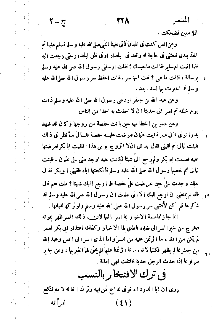 إنما جاز لفاطمة الإخبار بما أسر إليها لأن ذلك السر ظهر بموته فخرج من خبر السر إلى ضده فأطلق لها الأخبار وكذلك اعتذار أبي بكر لعمر لم يكن من إفشاء ما اؤتمن عليه من السر وأما الذي أسر إلى أنس وعبد الله بن جعفر مما لم يظهر فكتما لأنه أمانة اؤتمنا عليها فلم يحل لهما الخبر بها وعن جابر مرفوعا: "إذا حدث الرجل حديثا فالتفت فهي أمانة".