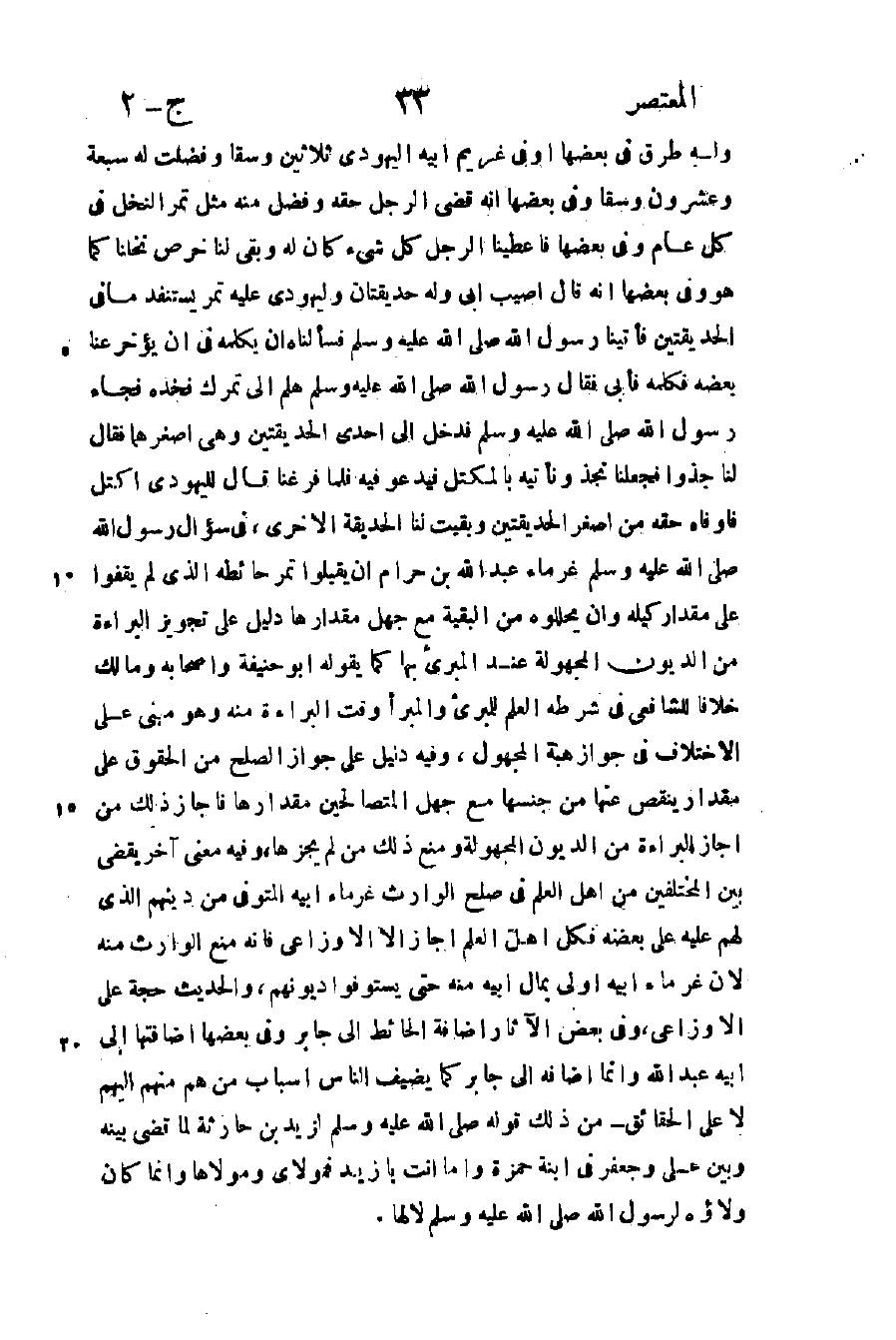 وله طرق في بعضها أو في غريم أبيه اليهودي ثلاثين وسقا وفضلت له سبعة وعشرون وسقا وفي بعضها أنه قضى الرجل حقه وفضل منه مثل تمر النخل في كل عام وفي بعضها فأعطينا الرجل كل شيء كان له وبقي لنا خرص نخلنا كما هو وفي بعضها أنه قال: أصيب أبي وله حديقتان وليهودي عليه تمر يستنفد ما في الحديقتين فأتينا رسول الله صلى الله عليه وسلم فسألناه أن يكلمه في أن يؤخر عنا بعضه فكلمه فأبى فقال رسول الله صلى الله عليه وسلم: "هلم إلى تمرك فخذه" فجاء رسول الله صلى الله عليه وسلم فدخل إلى إحدى الحديقتين وهي أصغرهما فقال لنا: "جذوا" فجعلنا نجذ ونأتيه بالمكتل فيدعو فيه فلما فرغنا قال لليهودي: "اكتل" فأوفاه حقه من أصغر الحديقتين وبقيت لنا الحديقة الأخرى، في سؤال رسول الله صلى الله عليه وسلم غرماء عبد الله بن حرام أن يقبلوا تمر حائطه الذي لم يقفوا على مقدار كيله وأن يحللوه من البقية مع جهل مقدارها دليل على تجويز البراءة من الديون المجهولة عند المبرئ بها كما يقوله أبو حنيفة وأصحابه ومالك خلافا للشافعي في شرطه العلم للمبرئ والمبرأ وقت البراءة منه وهو مبني على الاختلاف في جواز هبة المجهول وفيه دليل على جواز الصلح من الحقوق على مقدار ينقص عنها من جنسها مع جهل المتصالحين مقدارها فأجاز ذلك من أجاز البراءة من الديون المجهولة ومنع ذلك من لم يجزها وفيه معنى آخر يقضي بين المختلفين من أهل العلم في صلح الوارث غرماء أبيه المتوفى من دينهم الذي لهم عليه على بعضه فكل أهل العلم أجاز إلا الأوزاعي فإنه منع الوارث منه لأن غرماء أبيه أولى بمال أبيه منه حتى يستوفوا ديونهم، والحديث حجة على الأوزاعي وفي بعض الآثار إضافة الحائط إلى جابر وفي بعضها إضافتها إلى أبيه عبد الله وإنما إضافة إلى جابر كما يضيف الناس أسباب من هم منهم إليهم لا على الحقائق من ذلك قوله صلى الله عليه وسلم لزيد بن حارثة لما قضى بينه وبين علي وجعفر في ابنة حمزة وأما أنت يا زيد فمولاي ومولاها وإنما كان ولاؤه لرسول الله صلى الله عليه وسلم لا لها.