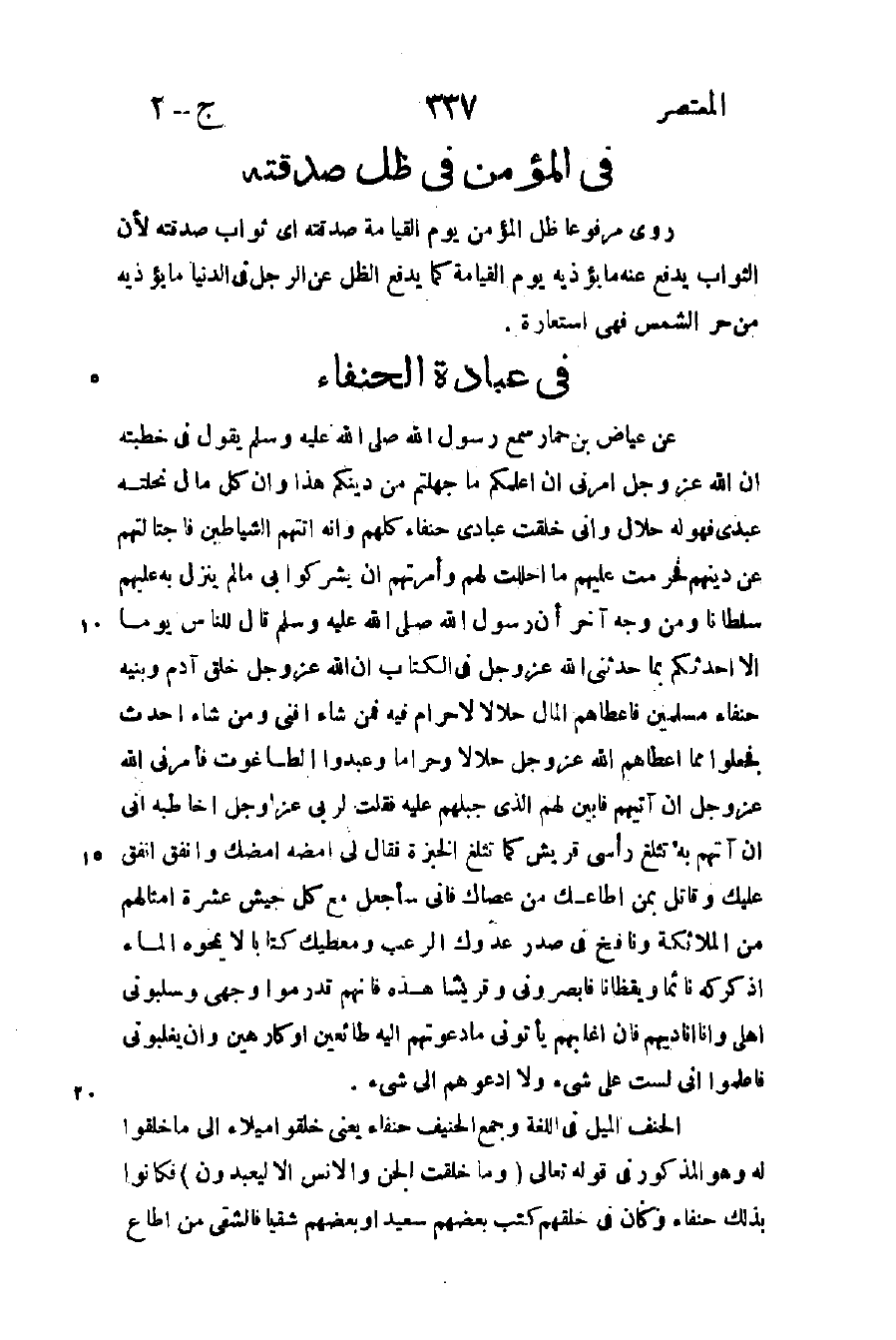 عن عياض بن حمار سمع رسول الله صلى الله عليه وسلم يقول في خطبته: "أن الله عز وجل أمرني أن أعلمكم ما جهلتم من دينكم هذا وإن كل مال نحلته عبدي فهو له حلال وإني خلقت عبادي حنفاء كلهم وأنه أتتهم الشياطين فاجتالتهم عن دينهم فحرمت عليهم ما أحللت لهم وأمرتهم أن يشركوا بي ما لم ينزل به عليهم سلطانا"، ومن وجه آخر أن رسول الله صلى الله عليه وسلم قال للناس يوما: "إلا أحدثكم بما حدثني الله عز وجل في الكتاب أن الله عز وجل خلق آدم وبنيه حنفاء مسلمين فأعطاهم المال حلالا لا حرام فيه فمن شاء أفنى ومن شاء أحدث فجعلوا مما أعطاهم الله عز وجل حلالا وحراما وعبدوا الطاغوت فأمرني الله عز وجل أن آتيهم فأبين لهم الذي جبلهم عليه فقلت لربي عز وجل أخاطبه: إني أن آتهم به تثلغ رأسي قريش كما تثلغ الخبزة فقال لي: أمضه أمضك وانفق انفق عليك وقاتل بمن أطاعك من عصاك فإني سأجعل مع كل جيش عشرة أمثالهم من الملائكة ونافخ في صدر عدوك الرعب ومعطيك كتابا لا يمحوه الماء أذكركه نائما ويقظانا فأبصروني وقريشا هذه فإنهم قد رموا وجهي وسلبوني أهلي وأنا أناديهم فإن أغلبهم يأتوني ما دعوتهم إليه طائعين أو كارهين وإن يغلبوني فاعلموا إني لست على شيء ولا أدعوهم إلى شيء".