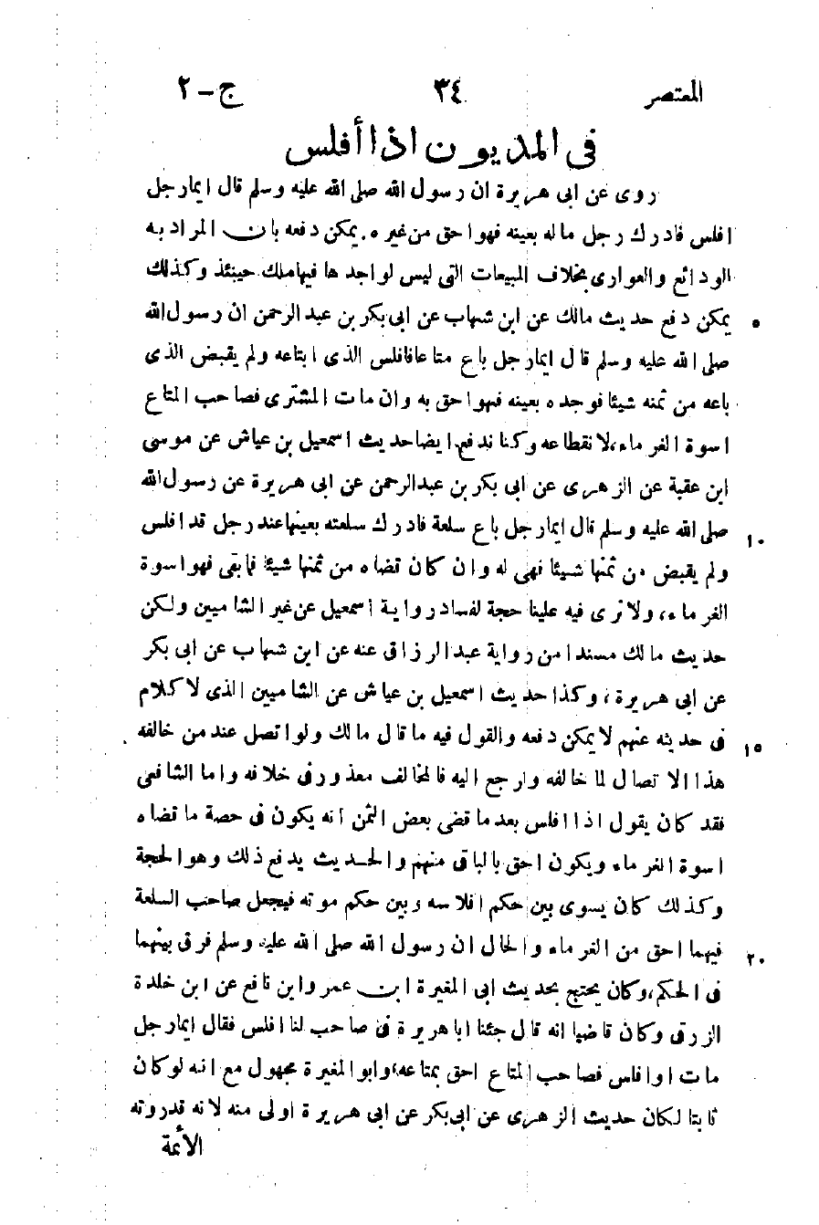 روى عن أبي هريرة أن رسول الله صلى الله عليه وسلم قال: "إيما رجل أفلس فأدرك رجل ما له بعينه فهو أحق من غيره". يمكن دفعه بأن المراد به الودائع والعواري بخلاف المبيعات التي ليس لواجدها فيها ملك حينئذ وكذلك يمكن دفع حديث مالك عن ابن شهاب عن أبي بكر بن عبد الرحمن أن رسول الله صلى الله عليه وسلم قال: "إيما رجل باع متاعا فأفلس الذي ابتاعه ولم يقبض الذي باعه من ثمنه شيئا فوجده بعينه فهو أحق به وإن مات المشتري فصاحب المتاع إسوة الغرماء" لانقطاعه وكنا ندفع أيضا حديث اسماعيل بن عياش عن موسى ابن عقبة عن الزهري عن أبي بكر بن عبد الرحمن عن أبي هريرة عن رسول الله صلى الله عليه وسلم قال: "إيما رجل باع سلعة فأدرك سلعته بعينها عند رجل قد أفلس ولم يقبض من ثمنها شيئا فهي له وإن كان قضاه من ثمنها شيئا فما بقي فهو إسوة الغرماء" ولا نرى فيه علينا حجة لفساد رواية اسماعيل عن غير الشاميين ولكن حديث مالك مسندا من رواية عبد الرزاق عنه عن ابن شهاب عن أبي بكر عن أبي هريرة وكذا حديث اسماعيل بن عياش عن الشاميين الذي لا كلام في حديثه عنهم لا يمكن دفعه والقول فيه ما قال مالك ولو اتصل عند من خالفه هذا الاتصال لما خالفه ولرجع إليه فالمخالف معذور في خلافه وأما الشافعي فقد كان يقول إذا أفلس بعد ما قضى بعض الثمن أنه يكون في حصة ما قضاه إسوة الغرماء ويكون أحق بالباقي منهم والحديث يدفع ذلك وهو الحجة وكذلك كان يسوي بين حكم إفلاسه وبين حكم موته فيجعل صاحب السلعة فيهما أحق من الغرماء والحال أن رسول الله صلى الله عليه وسلم فرق بينهما في الحكم وكان يحتج بحديث أبي المغيرة ابن عمرو ابن نافع عن ابن خلدة الزرقي وكان قاضيا أنه قال: جئنا أبا هريرة في صاحب لنا أفلس فقال: إيما رجل مات أو أفلس فصاحب المتاع أحق بمتاعه وأبو المغيرة مجهول مع أنه لو كان ثابتا لكان حديث الزهري عن أبي بكر عن أبي هريرة أولى منه لأنه قد روته