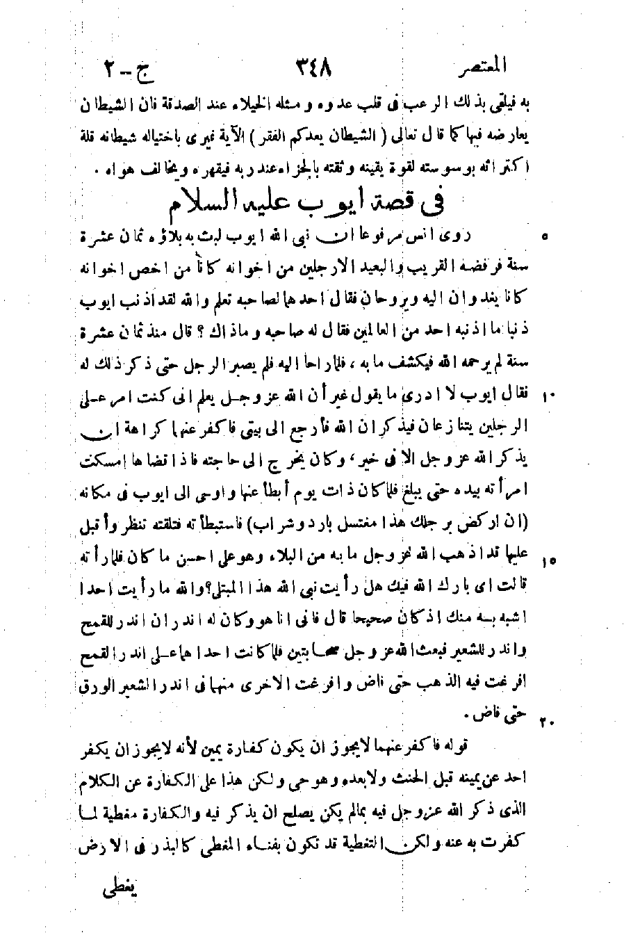 روي أنس مرفوعا أن نبي الله أيوب لبث به بلاؤه ثمان عشرة سنة فرفضه القريب والبعيد إلا رجلين من أخوانه كانا من أخص أخوانه كانا يغدوان إليه ويروحان فقال أحدهما لصاحبه تعلم والله لقد أذنب أيوب ذنبا ما أذنبه أحد من العالمين فقال له صاحبه وما ذاك قال منذ ثمان عشرة سنة لم يرحمه الله فيكشف ما به فلما راحا إليه فلم يصبر الرجل حتى ذكر ذلك له فقال أيوب لا أدري ما يقول غير أن الله عز وجل يعلم أني كنت أمر على الرجلين يتنازعان فيذكران الله فأرجع إلى بيتي فأكفر عنهما كراهة أن يذكر الله عز وجل إلا في خير وكان يخرج إلى حاجته فإذا قضاها أمسكت امرأته بيده حتى يبلغ فلما كان ذات يوم أبطأ عنها وأوحى إلى أيوب في مكانه اركض برجلك هذا مغتسل بارد وشراب فاستبطأته فتلقته تنظر وأقبل عليها قد أذهب الله عز وجل ما به من البلاء وهو على أحسن ما كان فلما رأته قالت أي بارك الله فيك هل رأيت نبي الله هذا المبتلى والله ما رأيت أحدا أشبه به منك إذ كان صحيحا قال فإني أنا هو وكان له أندران أندر للقمح وأندر للشعير فبعث الله عز وجل سحابتين فلما كانت إحداهما على اندر القمح أفرغت فيه الذهب حتى فاض وأفرغت الأخرى منهما في أندر الشعير الورق حتى فاض.