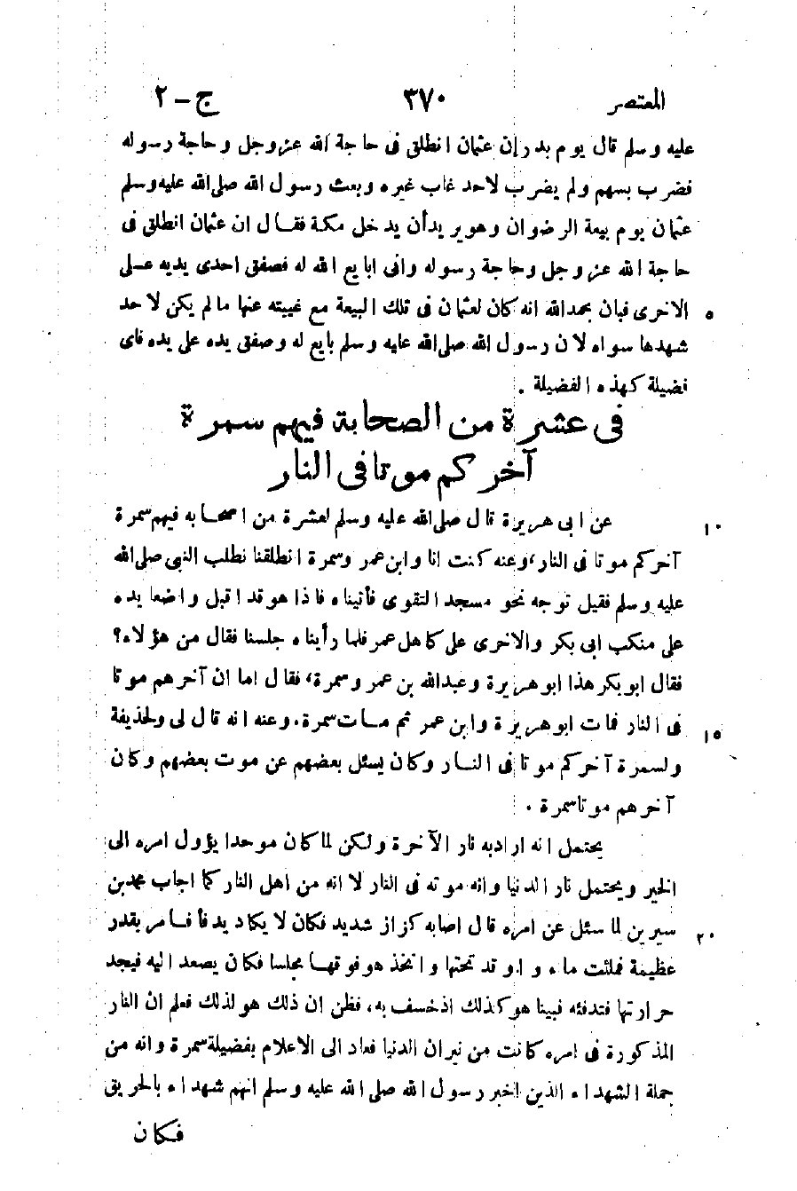 عليه وسلم قال يوم بدر: إن عثمان انطلق في حاجة الله عز وجل وحاجة رسوله فضرب بسهم ولم يضرب لأحد غاب غيره وبعث رسول الله صلى الله عليه وسلم عثمان يوم بيعة الرضوان وهو يريد أن يدخل مكة فقال: إن عثمان انطلق في حاجة الله عز وجل وحاجة رسوله وإني أبايع الله له فصفق إحدى يديه على الأخرى فبان بحمد الله أنه كان لعثمان في تلك البيعة مع غيبته عنها ما لم يكن لأحد شهدها سواه لأن رسول الله صلى الله عليه وسلم بايع له وصفق يده على يده فأي فضيلة كهذه الفضيلة.