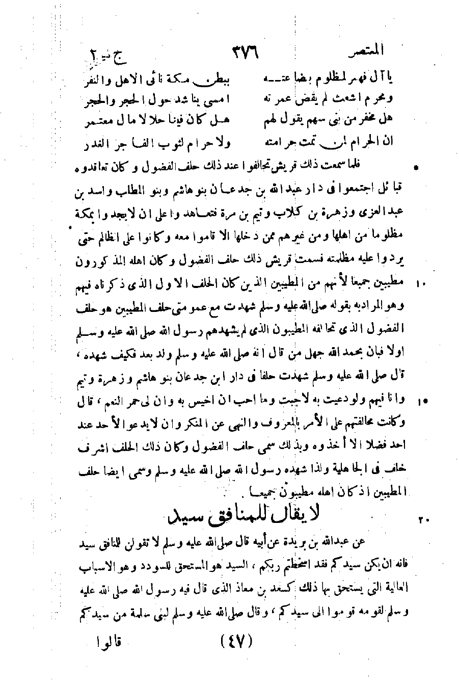 فلما سمعت ذلك قريش تحالفوا عند ذلك حلف الفضول وكان تعاقدوه قبائل اجتمعوا في دار عبد الله ابن جدعان بنو هاشم وبنو المطلب وأسد بن عبد العزي وزهرة بن كلاب وتيم بن مرة فتعاهدوا على أن لا يجدوا بمكة مظلوما من أهلها ومن غيرهم ممن دخلها إلا قاموا معه وكانوا على الظالم حتى يردوا عليه مظلمته فسمت قريش ذلك حلف الفضول وكان أهله المذكورون مطيبين جميعا لأنهم من المطيبين الذين كان الحلف الأول الذي ذكرناه فيهم وهو المراد به بقوله صلى الله عليه وسلم: "شهدت مع عمومتي حلف المطيبين" هو حلف الفضول الذي تحالفه المطيبون الذي لم يشهدهم رسول الله صلى الله عليه وسلم أولا فبان بحمد الله جهل من قال أنه صلى الله عليه وسلم ولد بعد فكيف شهده قال صلى الله عليه وسلم: "شهدت حلفا في دار ابن جدعان بنو هاشم زهرة وتيم وأنا فيهم ولو دعيت به لأجبت وما أحب أن أخيس به وإن لي حمر النعم"، قال: وكانت محالفتهم على الأمر بالمعروف والنهي عن المنكر وأن لا يدعو الأحد عند أحد فضلا إلا أخذوه وبذلك سمي حلف الفضول وكان ذلك الحلف أشرف حلف في الجاهلية ولذا شهده رسول الله صلى الله عليه وسلم وسمي أيضا حلف المطيبين إذ كان أهله مطيبون جميعا.