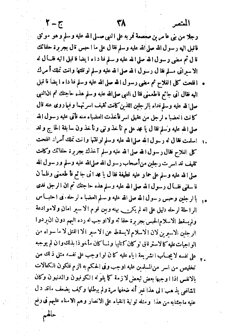 رجلا من بني عامر بن صعصعة فمر به على النبي صلى الله عليه وسلم وهو موثق فأقبل إليه رسول الله صلى الله عليه وسلم فقال: "على ما أحبس" قال: بجريرة حلفائك قال: ثم مضى رسول الله صلى الله عليه وسلم فناداه أيضا فأقبل إليه فقال له الأسير: إني مسلم فقال رسول الله صلى الله عليه وسلم: "لو قلتها وأنت تملك أمرك أفلحت كل الفلاح" ثم مضى رسول الله صلى الله عليه وسلم فناداه أيضا فأقبل إليه فقال: إني جائع فأطعمني فقال النبي صلى الله عليه وسلم: "هذه حاجتك" ثم أن النبي صلى الله عليه وسلم فداه بالرجلين اللذين كانت ثقيف أسرتهما وفيما روى عنه قال: كانت العضباء لرجل من عقيل أسر فأخذت العضباء منه فأتى عليه رسول الله صلى الله عليه وسلم فقال: يا محمد على م تأخذونني وتأخذون سابقة الحاج وقد أسلمت فقال له رسول الله صلى الله عليه وسلم: "لو قلتها وأنت تملك أمرك أفلحت كل الفلاح" فقال رسول الله صلى الله عليه وسلم: "آخذك بجريرة حلفائك" وكانت ثقيف قد أسرت رجلين من أصحاب رسول الله صلى الله عليه وسلم ورسول الله صلى الله عليه وسلم على حمار عليه قطيفة فقال: يا محمد إني جائع فأطعمني وظمآن فاسقني فقال رسول الله صلى الله عليه وسلم: "هذه حاجتك" ثم أن الرجل فدى بالرجلين وحبس رسول الله صلى الله عليه وسلم العضباء لرحله في احتباس الراحلة لرحله دليل على أنه لم يكن بينه وبين قوم الأسير أمان ولا موادعة ولم يسقط الإسلام الحبس بجريرة حلفائه ولا أوجب له رده إليهم دون أن يردوا الرجلين الإسيرين لأن الإسلام لا يسقط عن الأسير إلا القتل لا ما سواه من الواجبات عليه كالاسترقاق لو كان كتابيا ولما كان مأخوذا بذلك وإن لم يوجبه على نفسه لا يجاب الشريعة إياه عليه كان لو أوجب على نفسه مثل ذلك من تخليص من أسر من المسلمين عليه أوجب وفي الحكم به ألزم فتكون الكفالات بالأنفس إذا وجبها بعض لبعض لازمة كما يقوله الكوفيون والمدنيون وكان الشافعي يذهب إلى هذا غير أنه ضعفها مرة ولم يبطلها وكيف يضعف ما قد دل عليه ما جئنا به من هذا ومثله تولية النقباء على الأنصار وهم الأمناء عليهم في رفع