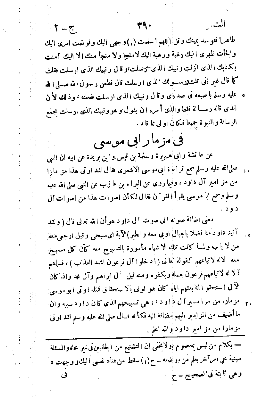 عن عائشة وأبي هريرة وسلمة بن قيس وابن بريدة عن أبيه أن النبي صلى الله عليه وسلم سمع قراءة أبي موسى الأشعري فقال: "لقد أوتي هذا مزمارا من مزامير آل داود"، وفيما روي عن البراء بن عازب عن النبي صلى الله عليه وسلم وسمع أبا موسى يقرأ القرآن فقال: "لكأن أصوات هذا من أصوات آل داود".