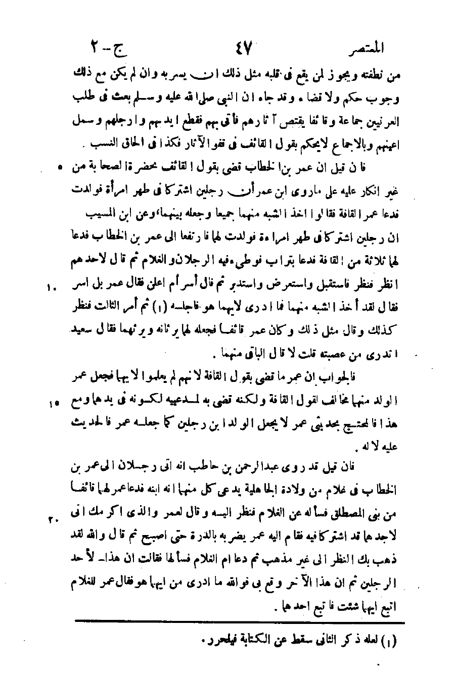 فإن قيل: قد روى عبد الرحمن بن حاطب أنه أتى رجلان إلى عمر بن الخطاب في غلام من ولادة الجاهلية يدعى كل منهما أنه ابنه فدعا عمر لهما قائفا من بني المصطلق فسأله عن الغلام فنظر إليه وقال لعمر: والذي أكرمك أني لأجدهما قد اشتركا فية فقام إليه عمر يضربه بالدرة حتى أصبح ثم قال: والله لقد ذهب بك النظر إلى غير مذهب ثم دعا أم الغلام فسألها فقالت: أن هذا لأحد الرجلين ثم أن هذا الآخر وقع بي فوالله ما أدري من أيهما هو فقال عمر للغلام: اتبع أيهما شئت فاتبع أحدهما