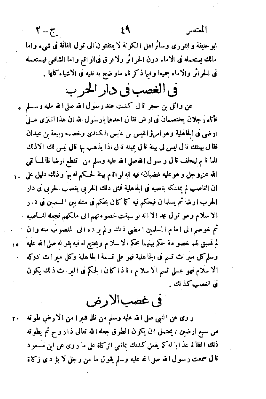 عن وائل بن حجر قال: كنت عند رسول الله صلى الله عليه وسلم فأتاه رجلان يختصمان في أرض فقال أحدهما: يا رسول الله إن هذا انتزى علي أرضي في الجاهلية وهو امرؤ القيس بن عابس الكندي وخصمه ربيعة بن عيدان فقال: "بينتك" قال: ليس لي بينة قال: "يمينه" قال: إذا يذهب بها قال: "ليس لك إلا ذلك" فلما قام ليحلف قال رسول الله صلى الله عليه وسلم: "من اقتطع أرضا ظالما لقي الله عز وجل وهو عليه غضبان" فيه أنه لو أقام بينة لحكم له بها وذلك دليل على أن الغاصب لم يملكه بغصبه في الجاهلية فمثل ذلك الحربى يغصب الحربى في دار الحرب أرضا ثم يسلمان فيحكم فيه كما كان يحكم في مثله بين المسلمين في دار الإسلام وهو قول محمد إلا أنه لو سبقت خصومتهم إلى ملكهم فجعله لغاصبه ثم خوصم إلى أمام المسلمين أمضى ذلك ولم يرده إلى المغصوب منه وإن لم تسبق لهم خصومة حكم بينهما بحكم الإسلام ويحتج له فيه بقوله صلى الله عليه وسلم: "كل ميراث قسم في الجاهلية فهو على قسمة الجاهلية وكل ميراث أدركه الإسلام فهو على قسم الإسلام" فإذا كان الحكم في الميراث ذلك يكون في الغصب كذلك.