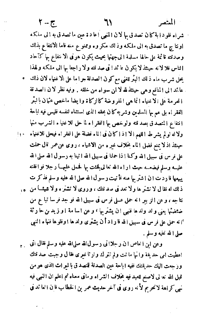 شراء فلو دابة كان تصدق بها لأن المنهي إعادة عين ما تصدق به إلى ملكه أو نتاج ما تصدق به إلى ملكه وذلك مكروه وممنوع منه فأما الانتفاع بذلك وصدقته قائمة على حالها مسلمة إلى جهتها بحيث يكون هو في الانتفاع بها كآحاد الناس فلا لأنه حينئذ لا يكون عائدا في صدقته ولا راجعا بها إلى ملكه ولهذا يحل شرب ماء ذلك البئر للغني مع كون الصدقة حراما على الأغنياء لأن ذلك عائد إلى المنافع وهي حينئذ لله لا لمن سواه من خلقه وفيه نظر لأن الصدقة المحرمة على الأغنياء إنما هي المفروضة كالزكاة وأيضا ما خص عثمان بالبئر الفقراء بل عم بها المسلمين وشربه كان بحقه الذي استثناه لنفسه فليس فيه إباحة انتفاع المتصدق بصدقته ولو خص بها الفقراء لما حل للأغنياء الشرب منها ولا له لو لم يشرط اللهم إلا إذا كان في الماء فضلة على الفقراء فيحل للأغنياء حينئذ إذ لا يمنع فضل الماء بخلاف غيره من الأشياء روى عن عمر قال: حملت على فرس في سبيل الله وكنا إذا حملنا في سبيل الله أتينا به رسول الله صلى الله عليه وسلم فيضعه حيث أراه الله تعالى فجئت بها فحمل عليها رجلا فوافقته يبيعها فأردت أن أشتريها منه فأتيت رسول الله صلى الله عليه وسلم فذكرت ذلك له فقال: "لا تشترها ولا تعد في صدقتك" وروى: لا تشتره ولا شيئا من نتاجه وعن الزبير أنه حمل على فرس في سبيل الله فوجد فرسا تباع من ضئضئها يعني: ولد ولدها فنهى أن يشتريها وعن أسامة أو زيد بن حارثة أنه حمل على فرس في سبيل الله فأراد أن يشتري ولدها أو فلوها فنهاه النبي صلى الله عليه وسلم.