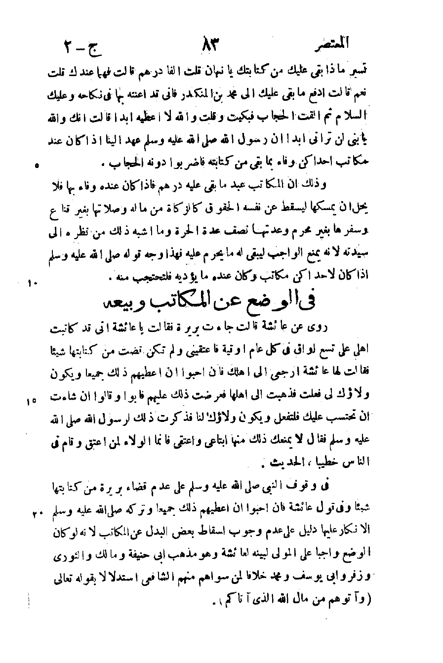 تسير ماذا بقي عليك من كتابتك يا نبهان قلت: ألفا درهم قالت: فهما عندك قلت: نعم قالت: ادفع ما بقي عليك إلى محمد بن المنكدر فإني قد أعنته بها في نكاحه وعليك السلام ثم ألقت الحجاب فبكيت وقلت: والله لا أعطيه أبدا قالت: إنك والله يا بني لن تراني أبدا إن رسول الله صلى الله عليه وسلم عهد إلينا إذا كان عند مكاتب أحداكن وفاء بما بقي من كتابته فأضربوا دونه الحجاب.