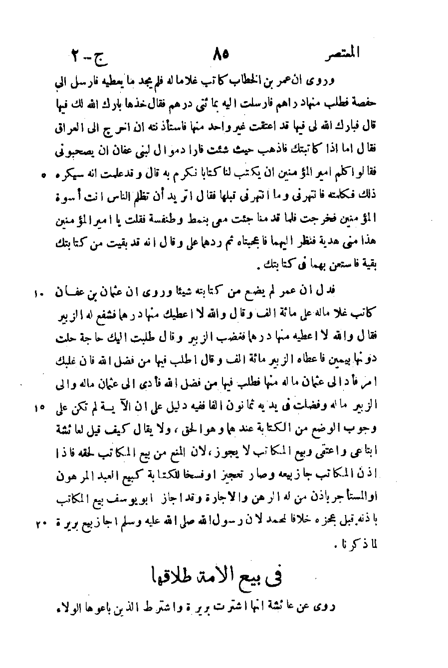 وروى أن عمر بن الخطاب كاتب غلاما له فلم يجد ما يعطيه فأرسل إلى حفصة فطلب منها دراهم فأرسلت إليه بمائتي درهم فقال: خذها بارك الله لك فيها قال: فبارك الله لي فيها قد اعتقت غير واحد منها فاستأذنته أن أخرج إلى العراق فقال: أما إذا كاتبتك فاذهب حيث شئت فأراد موال لبني عفان أن يصحبوني فقالوا: كلم أمير المؤمنين أن يكتب لنا كتابا نكرم به قال: وقد علمت أن سيكره ذلك فكلمته فانتهرني وما انتهرني قبلها فقال: أتريد أن تظلم الناس أنت أسوة المؤمنين فخرجت فلما قدمنا جئت معي بنمط وطنفسة فقلت: يا أمير المؤمنين هذا مني هدية فنظر إليهما فأعجبتاه ثم ردهما علي وقال: أنه قد بقيت من كتابتك بقية فاستعن بهما في كتابتك.