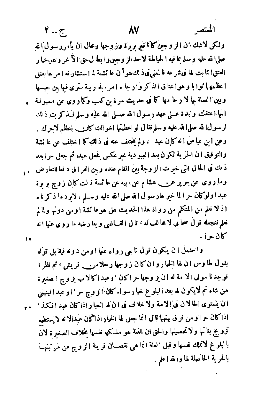 ولكن لا شك أن الزوجين كأنا غير بريرة وزوجها ومحال أن يأمر رسول الله صلى الله عليه وسلم بما فيه الحياطة لأحد الزوجين وإبطال حق الآخر وهو خيار العتق الثابت لها في شرعه فالمعنى في ذلك هو أن عائشة لما استشارته أمرها بعتق أعظمهما ثوابا وهو إعتاق الذكر وإرجاء أمر الجارية لترى فيها بين حبسها وبين الصلة بها لأرحامها كما في حديث مرة بن كعب وكما روى عن ميمونة أنها أعتقت وليدة علي عهد رسول الله صلى الله عليه وسلم فذكرت ذلك لرسول الله صلى الله عليه وسلم فقال: "لو أعطيتها أخوالك كان أعظم لأجرك" وعن ابن عباس أنه كان عبدا ولم يختلف عنه في ذلك كما اختلف عن عائشة والتوفيق أن الحرية تكون بعد العبودية غير عكس فجعل عبدا ثم جعل حرا بعد ذلك في الحال التي خيرت الزوجة بين المقام عنده وبين الفراق دفعا للتعارض وما روي عن جرير عن هشام عن أبيه عن عائشة قالت: كان زوج بريرة عبدا ولو كان حرا لما خيرها رسول الله صلى الله عليه وسلم لا يرد ما ذكرناه إذا لا نعلم من المتكلم من رواة هذا الحديث هل هو عائشة أو من دونها ولم لم نعلم فنجعله قول صحابي لا مخالف له قال القاضي: ويعارضه ما روي عنها أنه كان حرا.