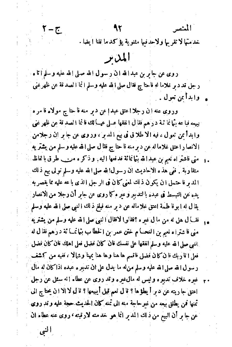 وروى عنه أن رجلا اعتق عبدا عن دبر منه فاحتاج مولاه فأمره ببيعه فباعه بثمانمائة درهم فقال: أنفقها على عيالك فإنما الصدقة عن ظهر غنى وأبدأ بمن تعول فيه الا طلاق في بيع المدبر وروى عن جابر أن رجلا من الأنصار أعتق غلاما له عن دبر منه فاحتاج فقال صلى الله عليه وسلم: "من يشتريه مني" فاشتراه نعيم بن عبد الله بثمانمائة فدفعها إليه وذكره من طرق بألفاظ متقاربة ففي هذه الأحاديث أن رسول الله صلى الله عليه وسلم تولى بيع ذلك المدبر فاحتمل أن يكون ذلك لمعنى كان في الرجل الذي باعه عليه مما يقصر به يده عن التبسط في عبده بالتدبير وغيره كما روى عن جابر أن رجلا من الأنصار يقال له: أبو فاطمة أعتق غلاما له عن دبر منه فبلغ ذلك النبي صلى الله عليه وسلم فقال: "هل له من مال غيره" فقالوا: لا فقال النبي صلى الله عليه وسلم: "من يشتريه مني" فاشتراه نعيم بن النحام ختن عمر بن الخطاب بثمانمائة درهم فقال له النبي صلى الله عليه وسلم: "أنفقها على نفسك فإن كان فضل فعلى أهلك فإن كان فضل فعلى أقاربك فإن كان فضل فاقسم ها هنا وها هنا يمينا وشمالا"، ففيه من كشف رسول الله صلى الله عليه وسلم من له ما يدل على أن تدبيره عبده إذا كان له مال غيره خلاف تدبيره وليس له مال غيره وقد روى عن عطاء أنه سئل عن رجل أعتق جاريته عن دبر أيطؤها؟ قال: نعم قيل: أيبيعها؟ قال: لا إلا أن يحتاج إلى ثمنها فمن يطلق بيعه من غير حاجة منه إلى ثمنه كان الحديث حجة عليه وقد روي عن جابر أن البيع من ذلك المدبر أنها هو خدمته لا رقبته روى عنه عطاء أن