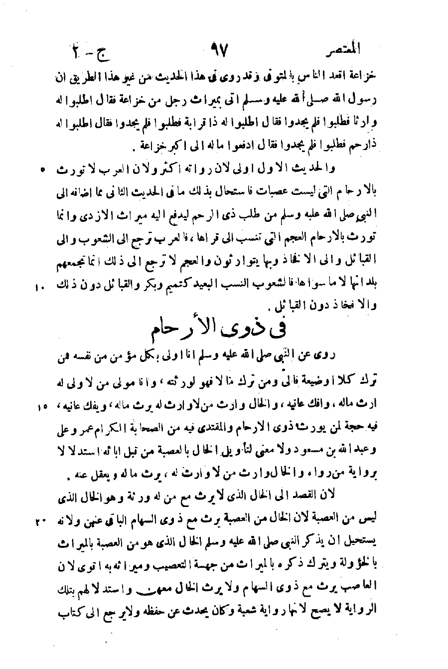 والحديث الأول اولى لأن رواته أكثر ولان العرب لا تورث بالأرحام التي ليست عصبات فاستحال بذلك ما في الحديث الثاني مما أضافه إلى النبي صلى الله عليه وسلم من طلب ذي الرحم ليدفع إليه ميراث الأزدي وإنما تورث بالأرحام العجم التي تنسب إلى قراها فالعرب ترجع إلى الشعوب وإلى القبائل وإلى الأفخاذ وبها يتوارثون والعجم لا ترجع إلى ذلك إنما تجمعهم بلدانها لا ما سواها فالشعوب النسب البعيد كتميم وبكر والقبائل دون ذلك والأفخاذ دون القبائل.