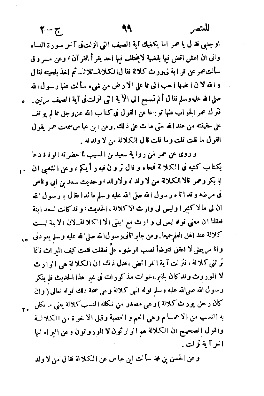 أو جنبي فقال: يا عمر أما يكفيك آية الصيف التي أنزلت في آخر سورة النساء وإني أن أعش أقض فيها بقضية لا يختلف فيها أحد يقرأ القرآن وعن مسروق سألت عمر عن قرابة لي ورث كلالة فقال: الكلالة ثلاثا ثم أخذ بلحيته فقال: والله لأن أعلمها أحب إلي مما على الأرض من شيء سألت عنها رسول الله صلى الله عليه وسلم فقال: "ألم تسمع إلي الآية التي أنزلت في آية الصيف مرتين". فترك عمر الجواب عنها تورعا عن القول في كتاب الله عز وجل مما لم يوقف على حقيقته من عند الله حتى مات على ذلك وعن ابن عباس سمعت عمر يقول: القول ما قلت قلت: وما قلت؟ قال: الكلالة من لا ولد له.