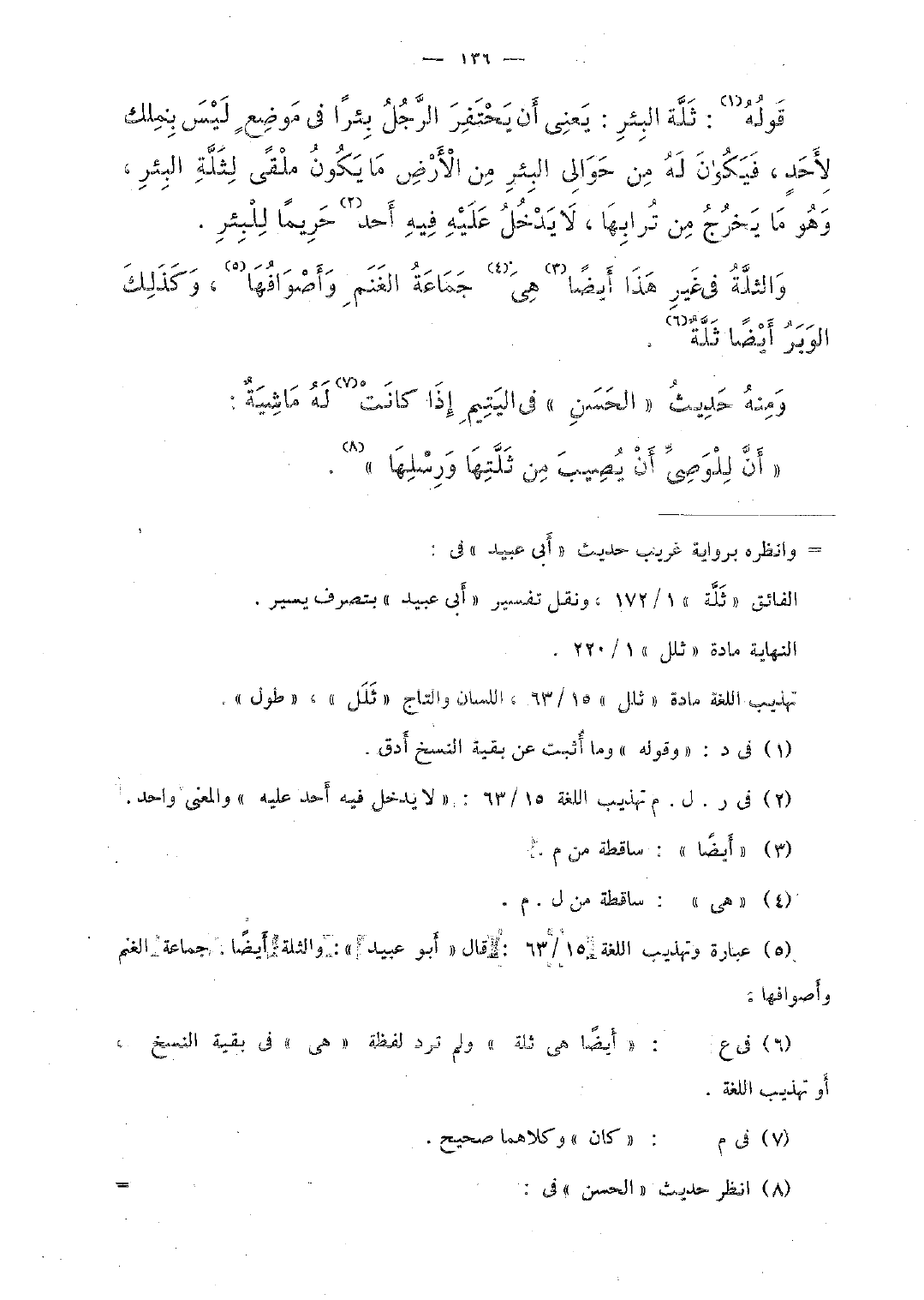 قوله: ثلَّة البئر: يعنى أن يحتفر الرَّجل بئرًا فى موضعٍ ليس بملك أحدٍ، فيكون له من حوالى البئر من الأرض ما يكون ملقًى لثلَّة البئر، وهو ما يخرج من ترابها، لا يدخل عليه فيه أحد حريمًا للبئر.