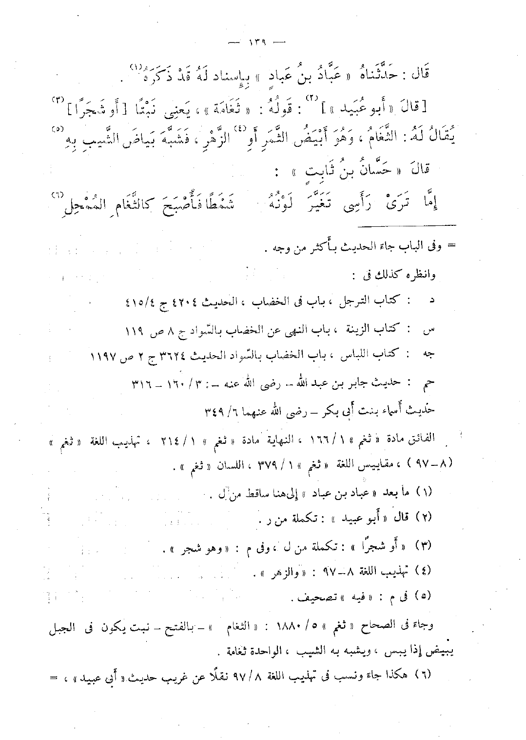 [قال "أبو عبيد"]: قوله: "ثغامة"، يعنى نبتًا [أو شجرًا] يقال له: الثَّغام، وهو أبيض الثَّمر أو الزَّهر، فشبَّه بياض الشَّيب به