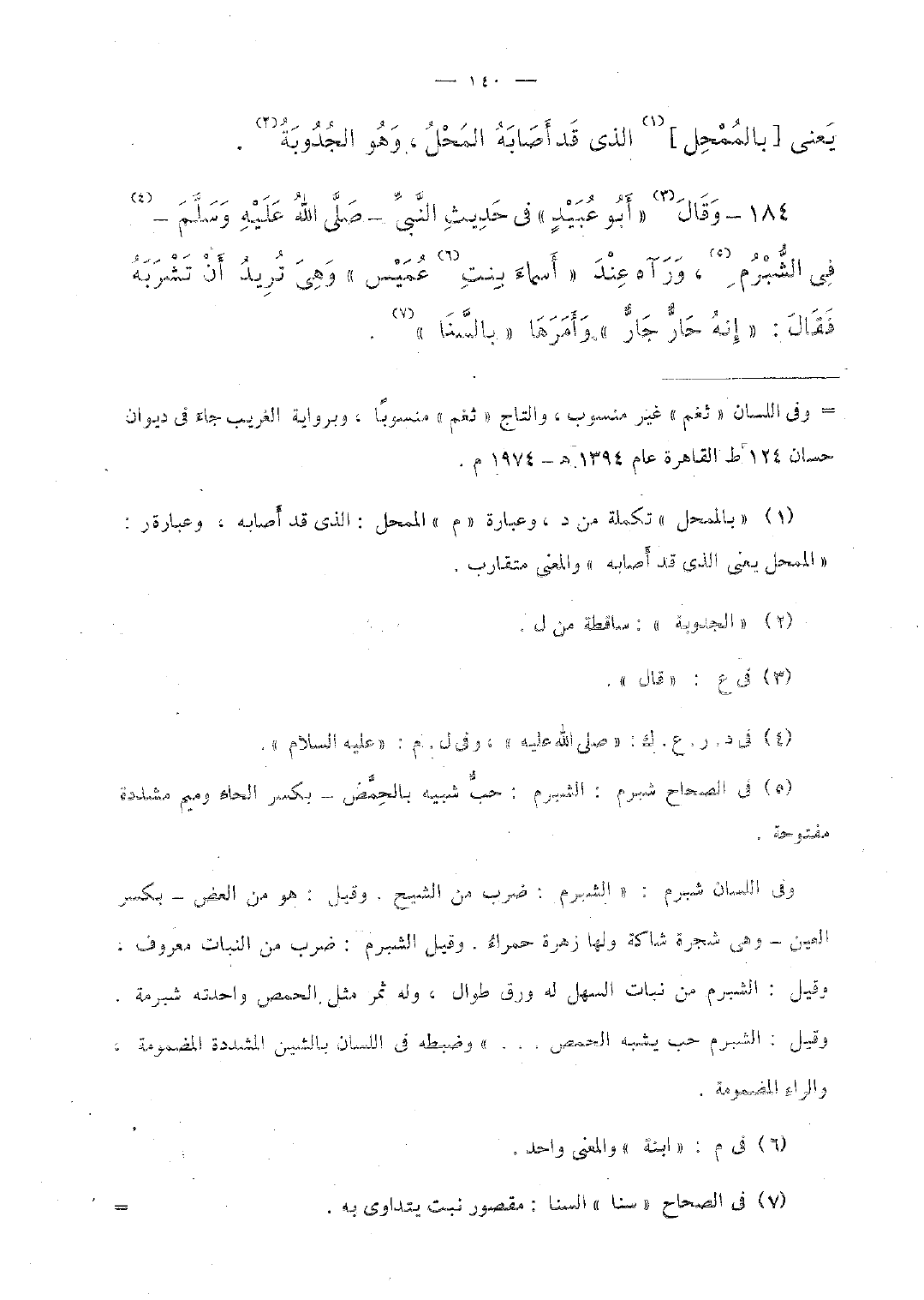 184 - وقال "أبو عبيد" فى حديث النَّبىَّ - صلَّى الله عليه وسلَّم- فى الشُّبرم، ورآه عند "اسماء بنت عميس" وهى تريد أن تشربه فقال: "إنه حارٌّ جارٌّ" وأمرها "بالسَّنا"