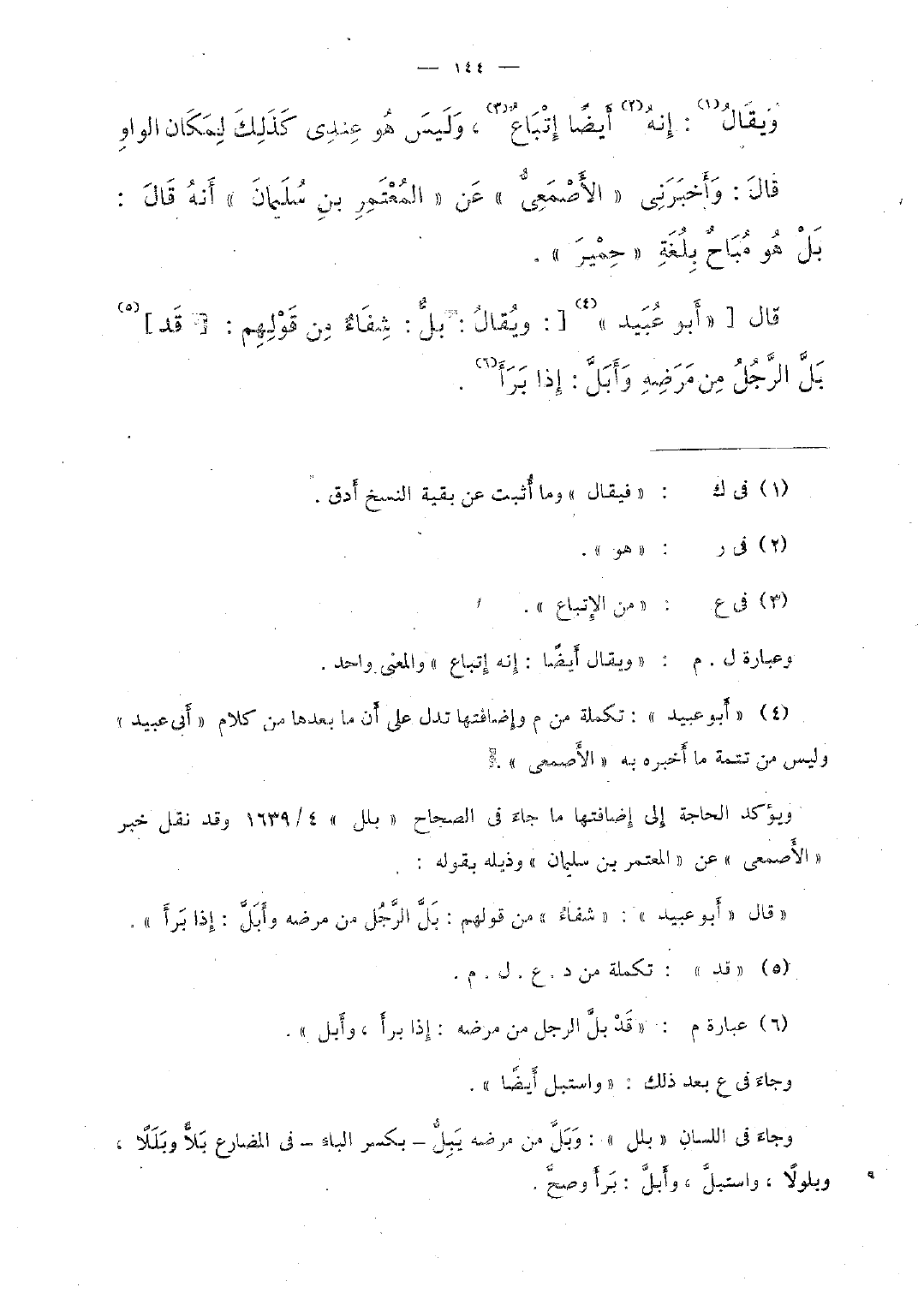 قال ["أبو عبيد" [: ويقال: بلُّ: شفاء من قولهم: [قد] بلَّ الرَّجل من مرضه وأبلَّ: إذا برأ.