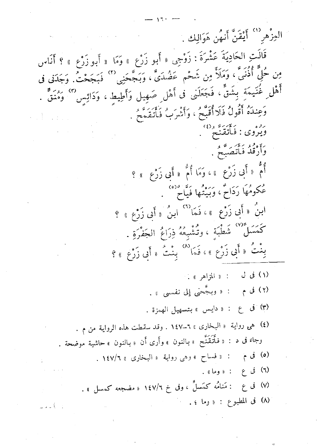 قالت الحادية عشرة: زوجى "أبو زرع" وما "أبو زرع"؟ أناس من حلىٍّ أدنىَّ، وملأ من شحم عضدىَّ، وبجَّحنى فبجحت. وجدنى فى أهل غنيمة بشقٍّ، فجعلنى فى أهل صهيل وأطيط، ودائس ومنقٍّ.