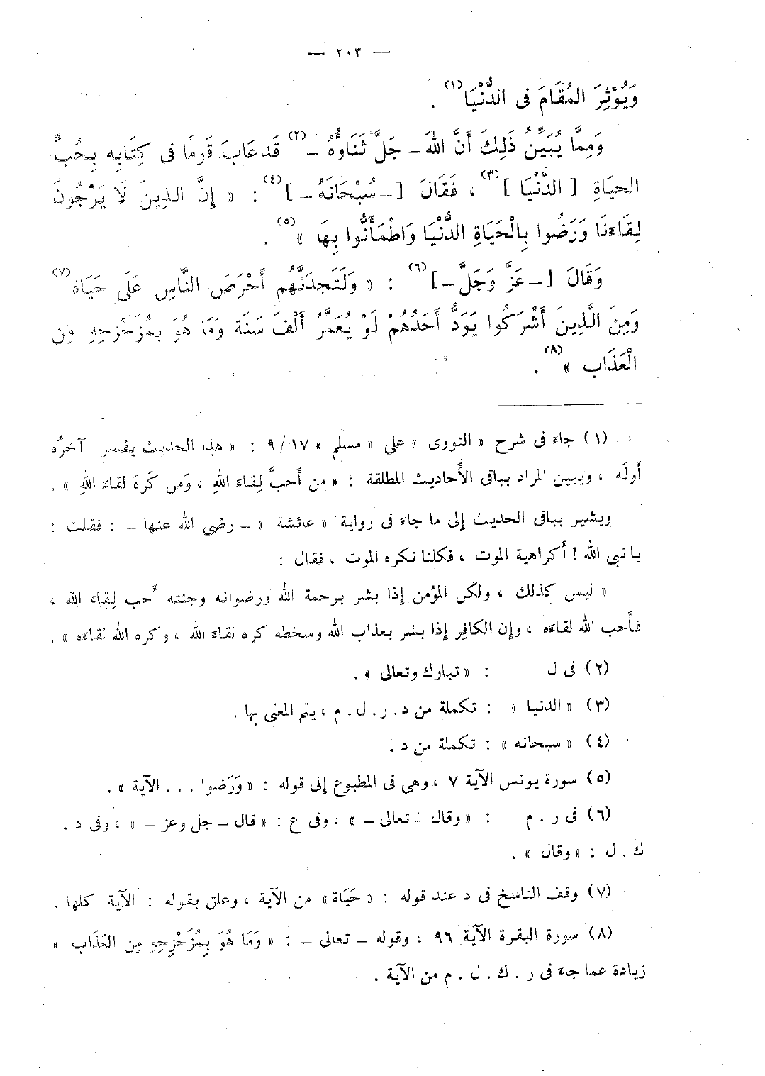وممَّا يبيِّن ذلك أنَّ الله- جلَّ ثناوه- قد عاب قومًا فى كتابه بحبِّ الحياة [الدُّنيا] , فقال [-سبحانه-]: "إنَّ الذين لا يرجون لقاءنا ورضوا بالحياة الدُّنيا واطمأنُّوا بها".