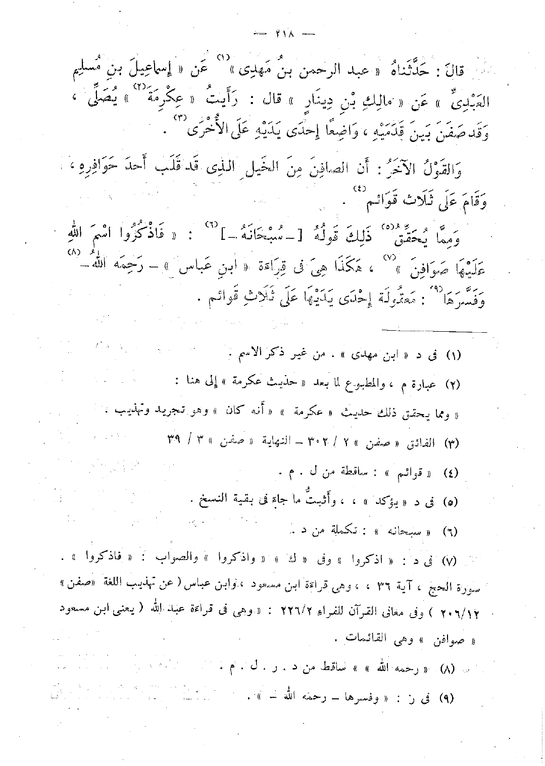 وممَّا يحقِّق ذلك قوله [- سبحانه-]: } فاذكروا اسم الله عليها صوافن {, هكذا هى فى قراءة "ابن عباس" - رحمه الله- وفسَّرها: معقولة إحدى يديها على ثلاث قوائم.