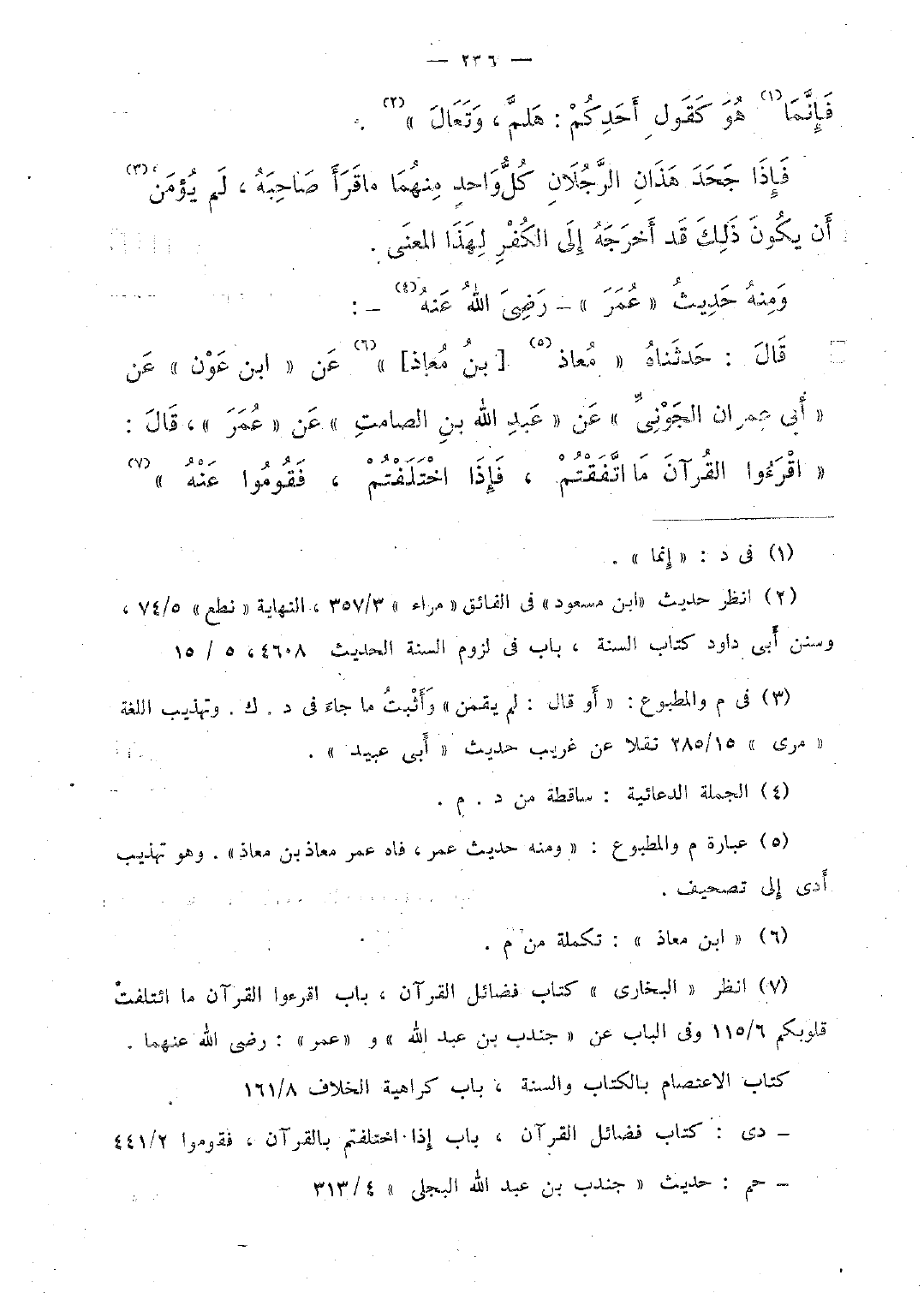 قال: حدثناه "معاذ [ين معاذ] " عن [ابن عون] عن "أبى عمران الجونىَّ" عن "عبد الله بن الصامت" عن "عمر"، قال: "اقرءوا القرآن ما اتَّفقتم، فإذا اختلفتم، فقوموا عنه".