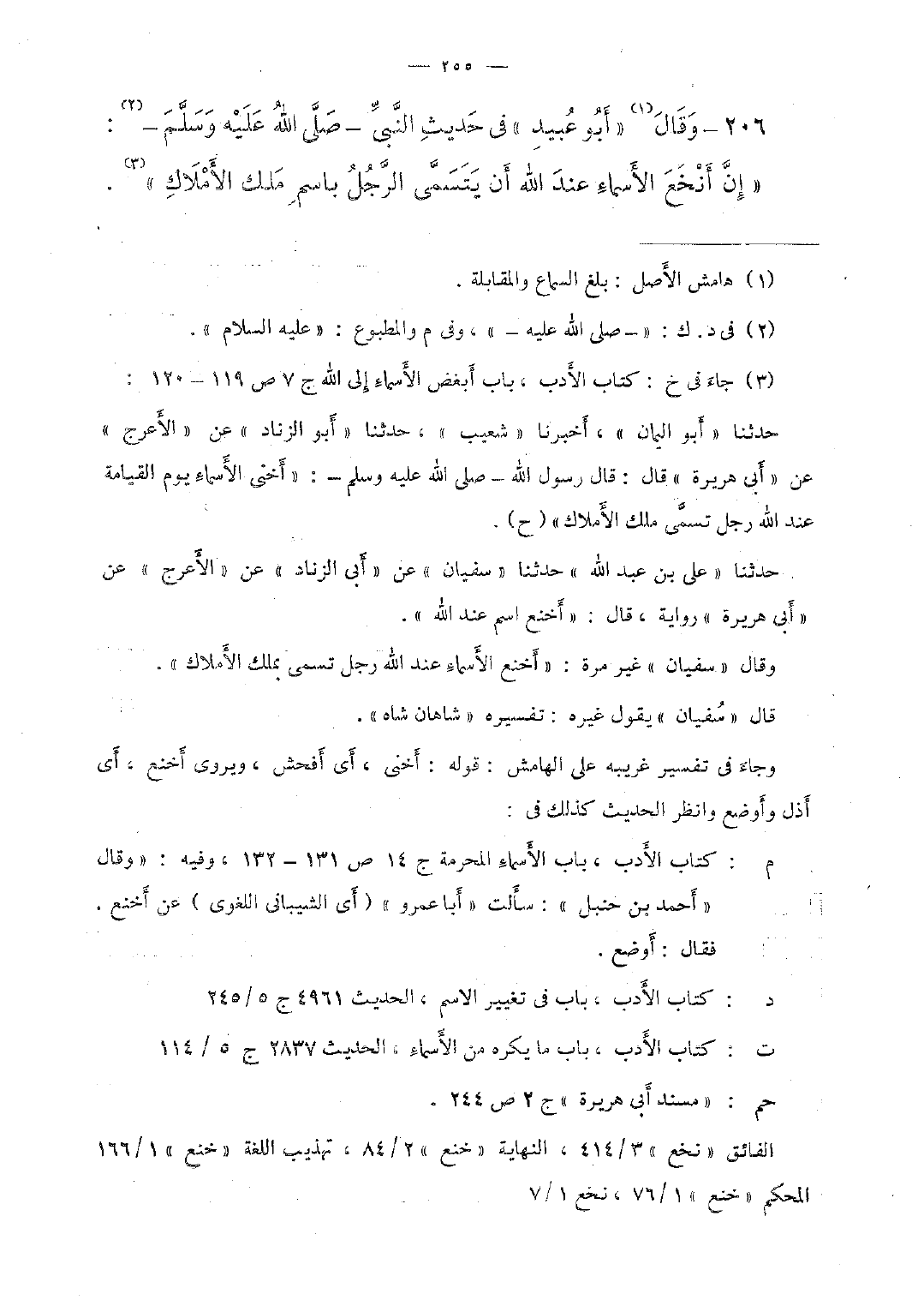 206 - وقال "أبو عبيد" في حديث النبي -صلى الله عليه وسلم-: "إن أنجع الأسماء عند الله أن يتسمّى الرجل باسم ملك الأملاك".