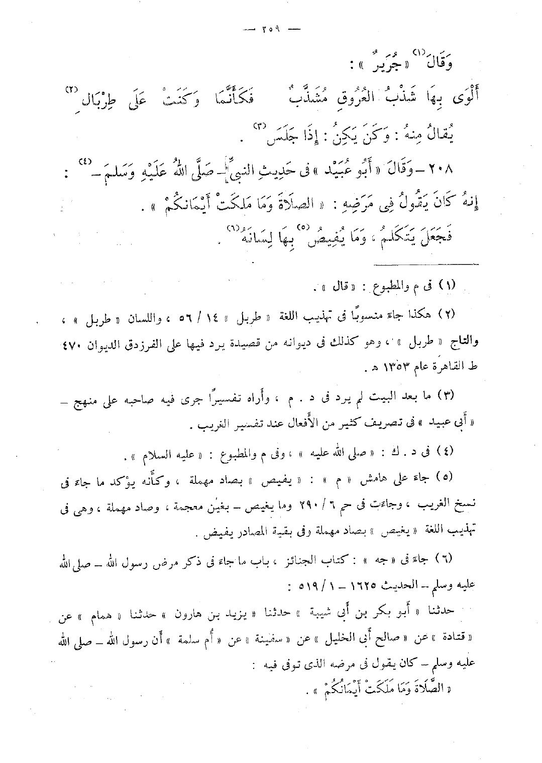 208 - وقال "أبو عبيد" في حديث النبيّ -صلّى الله عليه وسلم-: إنه كان يقول في مرضه: "الصلاة وما ملكت أيمانكم".