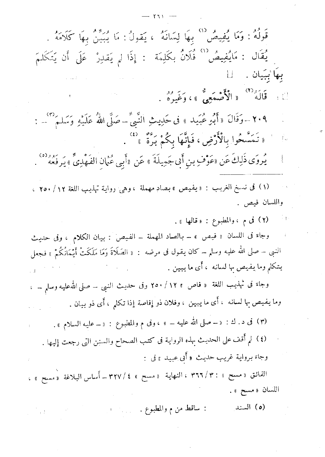 209 - وقال "أبو عبيد" في حديث النبي -صلّى الله عليه وسلم-: "تمسّحوا بالأض، فإنّها بكم برّة".