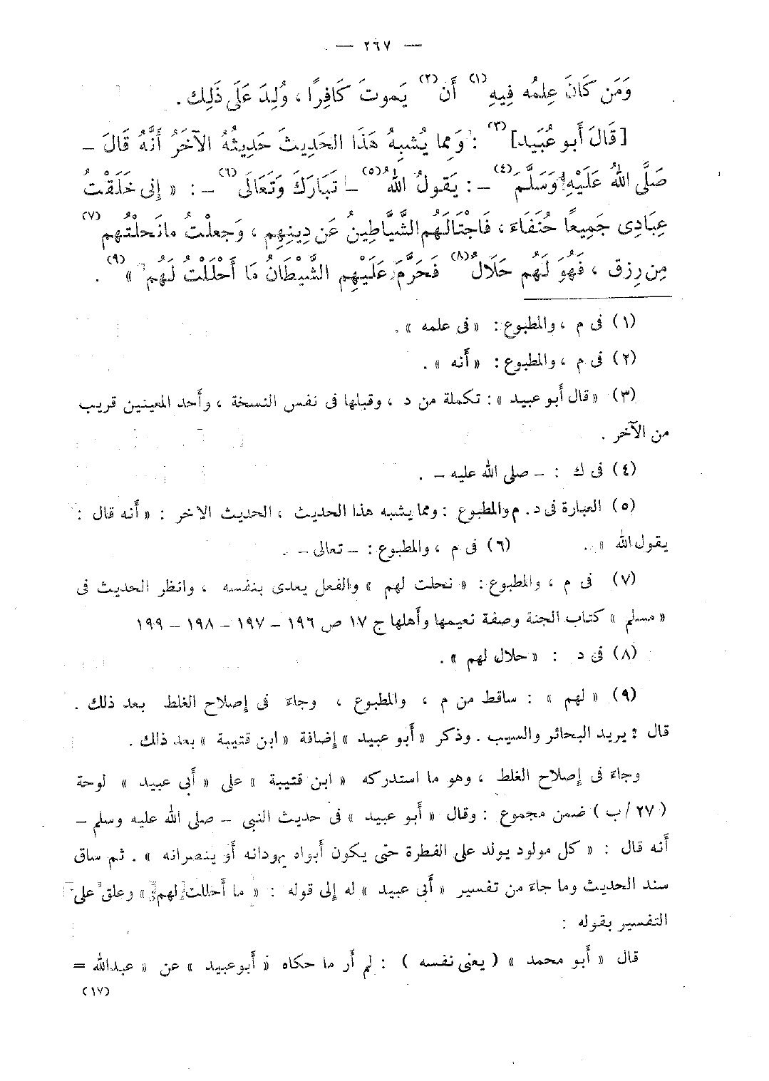 [قال أبو عبيد]: ومما يشبه هذا الحديث حديثه الآخر أنّه قال -صلّى الله عليه وسلّم-: يقول الله -تبارك وتعالى-: "إنى خلقت عبادى جميعًا حنفاء، فاجتالهم الشيّاطين عن دينهم، وجعلت مانحلتهم من رزق، فهو لهم حلال فحرّم عليهم الشّيطان ما أحلت لهم".