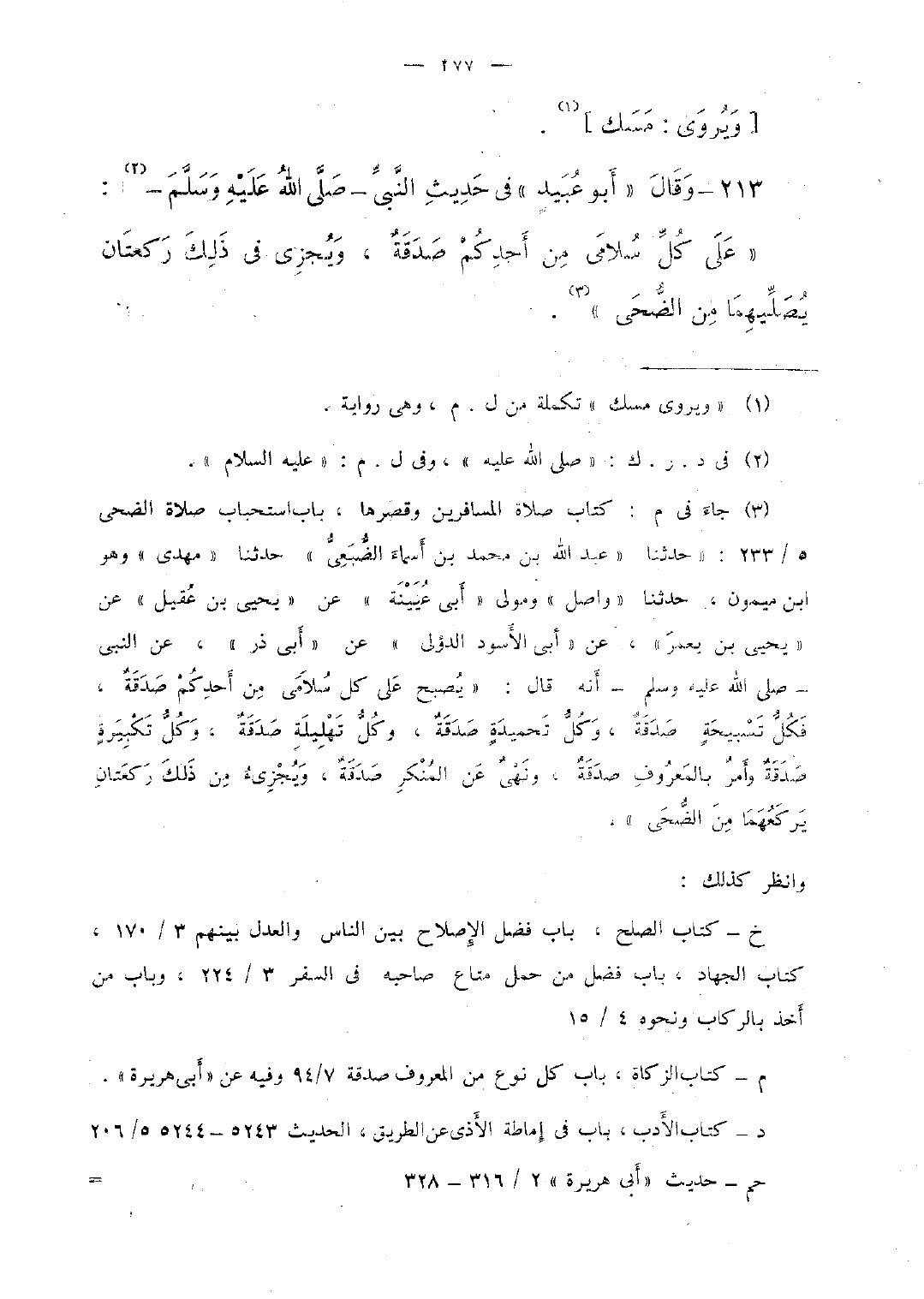 213 - وقال "أبو عبيد" فى حديث النّبىّ -صلّى الله عليه وسلّم-: "على كلّ سلامى من أحدكم صدقة، ويجزى فى ذلك ركعتان يصلّيهما من الضّحى".