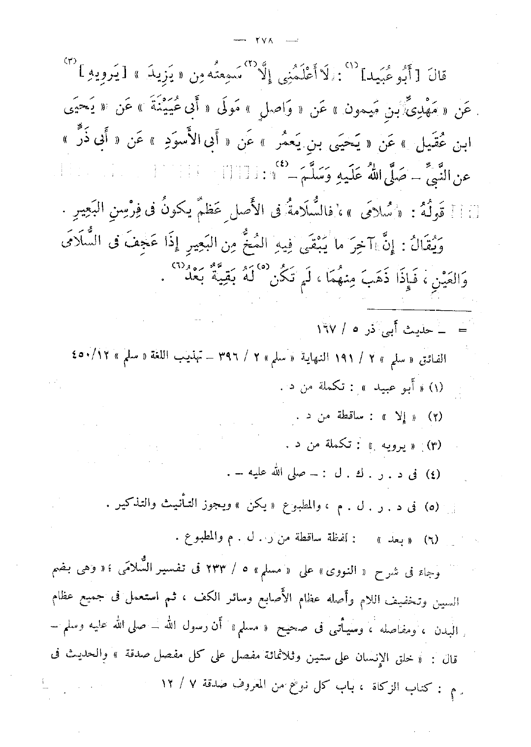 قال [أبو عبيد]: لا أعلمنى إلا سمعته من "يزيد" [يرويه] عن "مهدىّ بن ميمون" عن "واصل" مولى " أبى عيينة" عن "يحيى ابن عقيل" عن "يحيى بن يعمر" عن "أبى الأسود" عن "أبى ذرً" عن النّبىّ -صلّى الله عليه وسلّم-: