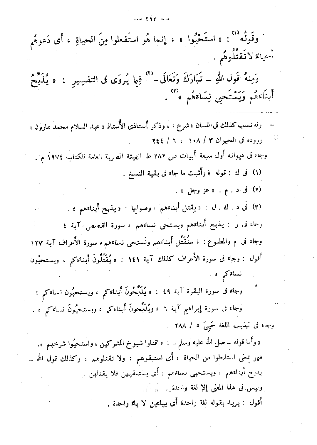 ومنه قول الله -تبارك وتعالى- فيما يروى فى التفسير: "يذبّح أبناءهم ويستحي نساءهم".