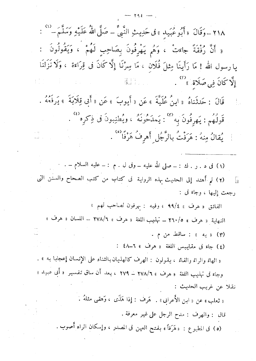 218 - وقال "أبو عبيدٍ" فى حديث النّبىّ -صلّى الله عليه وسلّم-: "أنّ رفقةً جاءت، وهم يهرفون بصاخبٍ لهم، ويقولون: يا رسول الله! ما رأينا مثل فلان، ما سرنا إلاّا كان فى قراءة، ولا نزلنا إلا كان فى صلاةٍ".