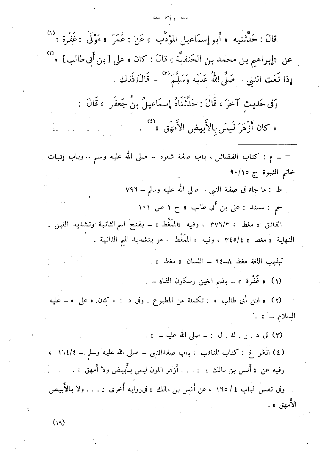 قال: حدّثنيه "أبو إسماعيل المؤدّب" عن "عمر" مولى "غفرة" عن "إبراهيم بن محمد بن الحنفيّة" قال: كان "على [بن أبى طالب] " إذا نعت النبى -صلّى الله عليه وسلّم- قال ذلك.