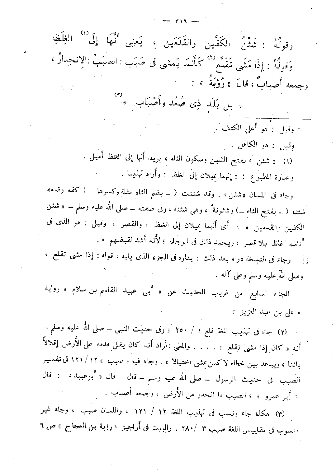 وقوله: ششن الكفّين والقدمين، يعنى أنّها إلى الغلظ وقوله: إذا مشى تقلّع كأنما يمشى فى صبب: الصبب: الانحدار، وجمعه أصباب، قال "رؤبة":