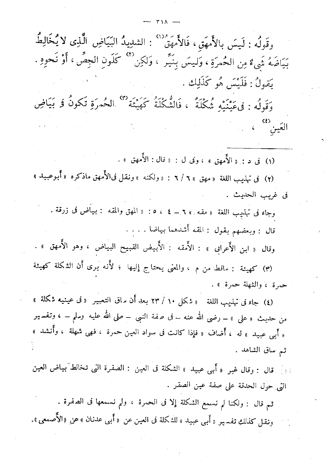 وقوله: فى عينيه شكلة، فالشّكلة كهيئة الحمرة تكون فى بياض العين،