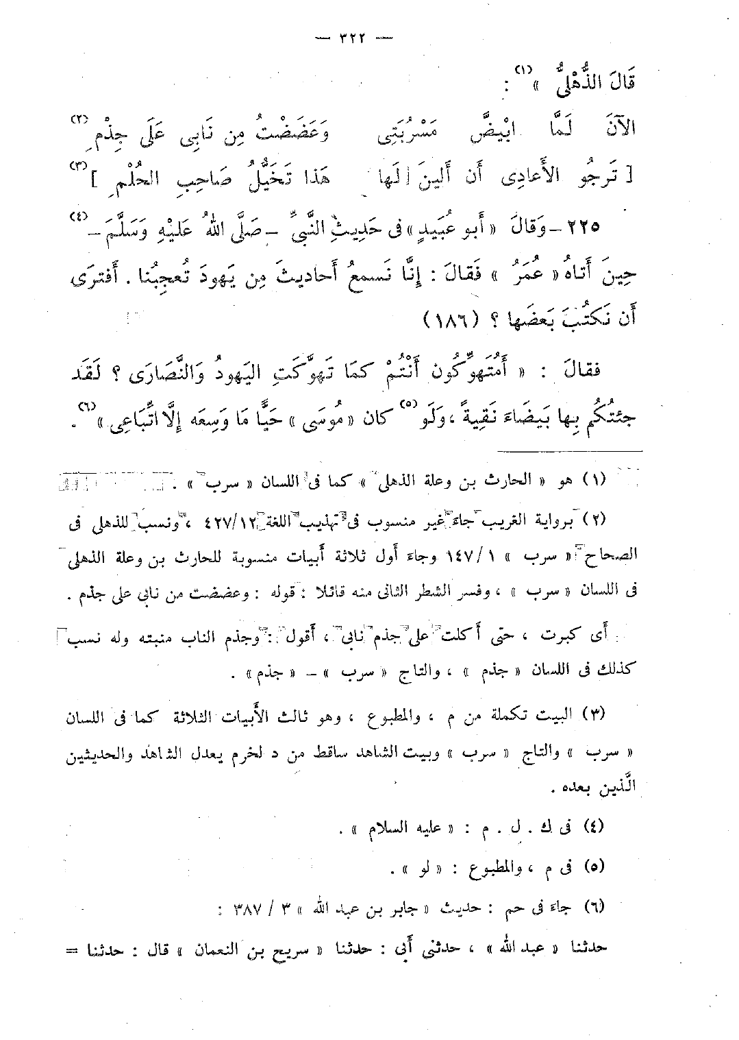225 - وقال "أبو عبيدٍ" فى حديث النّبىّ -صلّى الله عليه وسلّم- حين أتاه "عمر" فقال: إنّا نسمع أحاديث من يهود تعجبنا. أفترى أن نكتب بعضها؟ (186)