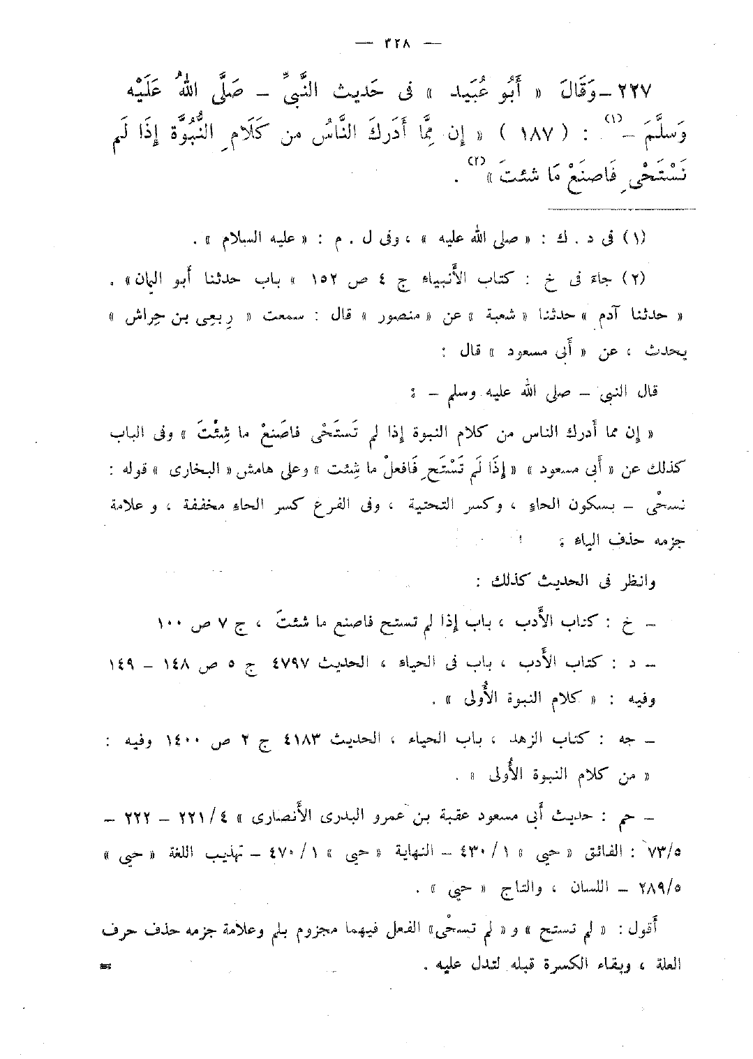 227 - وقال "أبو عبيد" فى حديث النّبىّ -صلّى الله عليه وسلّم-: (187) "إن مّما أدرك النّاس من كلام النّبوّة إذا لم نستحى فاصنع ما شئت".