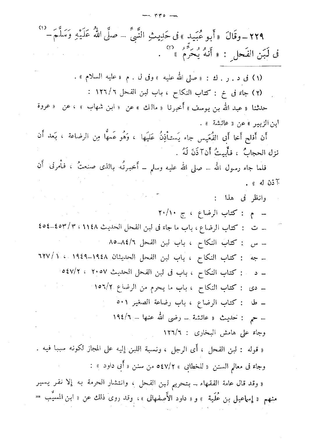 229 - وقال "أبو عبيدٍ" فى حديث النّبىّ -صلّى الله عليه وسلّم- في لبن الفحل: "أنه يحرّم".