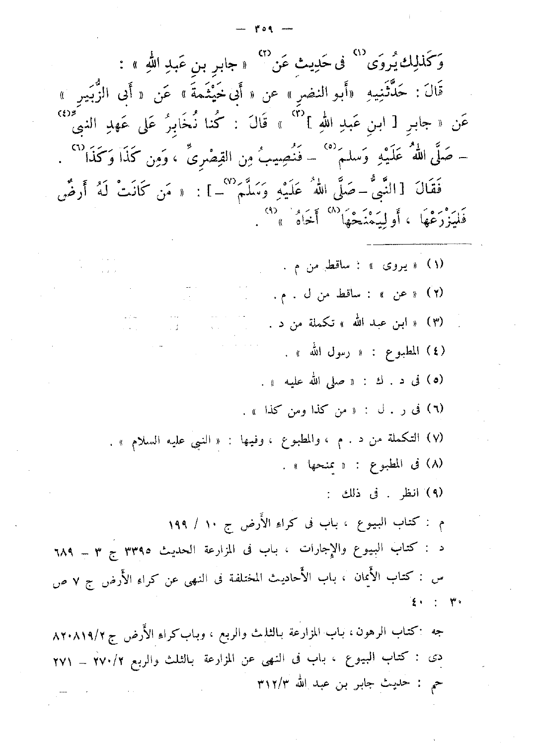 قال: حدَّثنيه "أبو النضر" عن "أبى خيثمة" عن "أبى الزُّبير" عن "جابر [ابن عبد الله] قال: كنا نخابر على عهد النبىِّ -صلَّى الله عليه وسلم- فنصيب من القصرىِّ، ومن كذا وكذا.