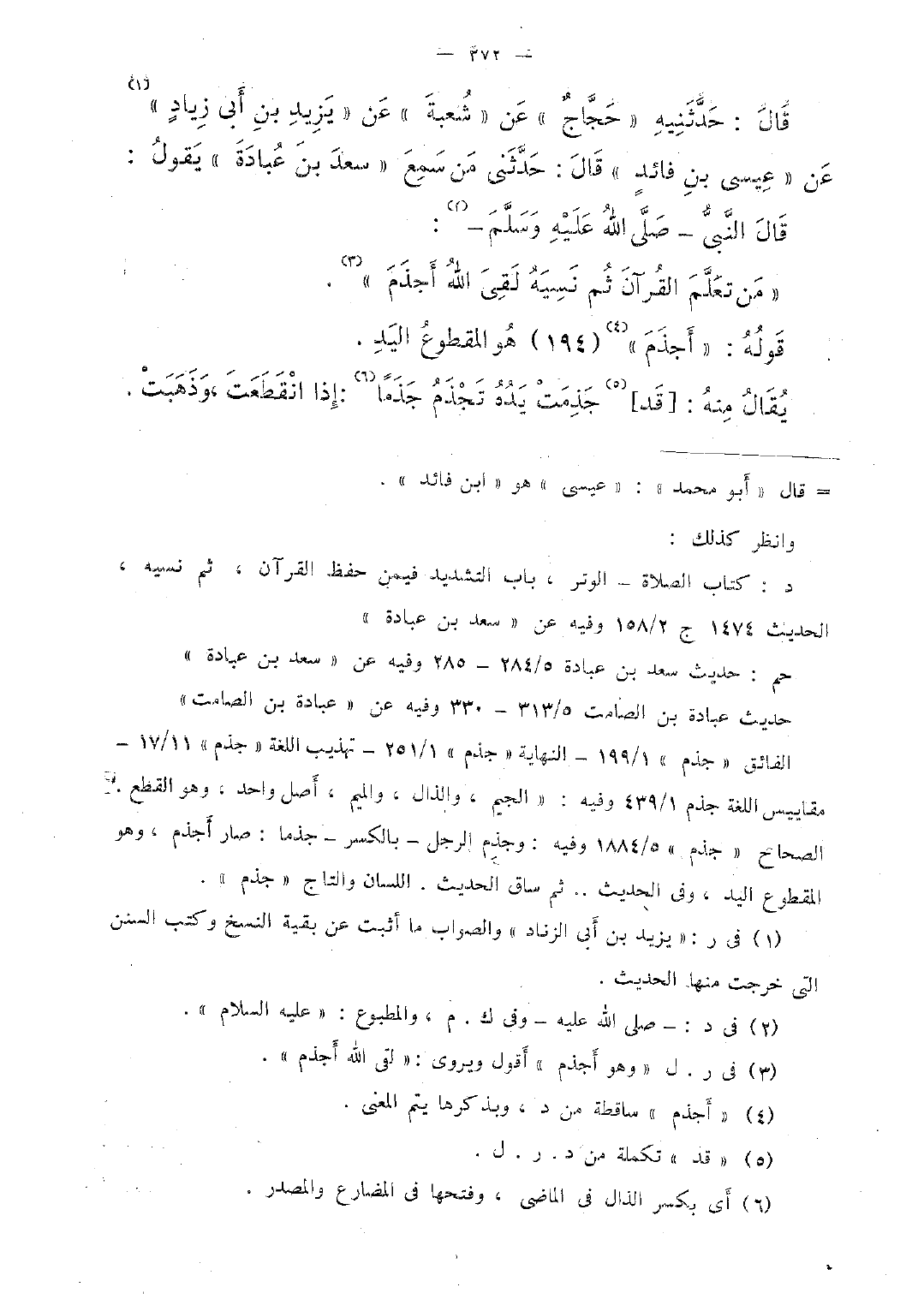 قال: حدَّثنيه "حجَّاج" عن "شعبة" عن "يزيد بن أبى زياد" عن "عيسى بن فائد" قال: حدَّثنى من سمع "سعد بن عبادة" يقول: قال النَّبىُّ -صلَّى الله عليه وسلَّم-: