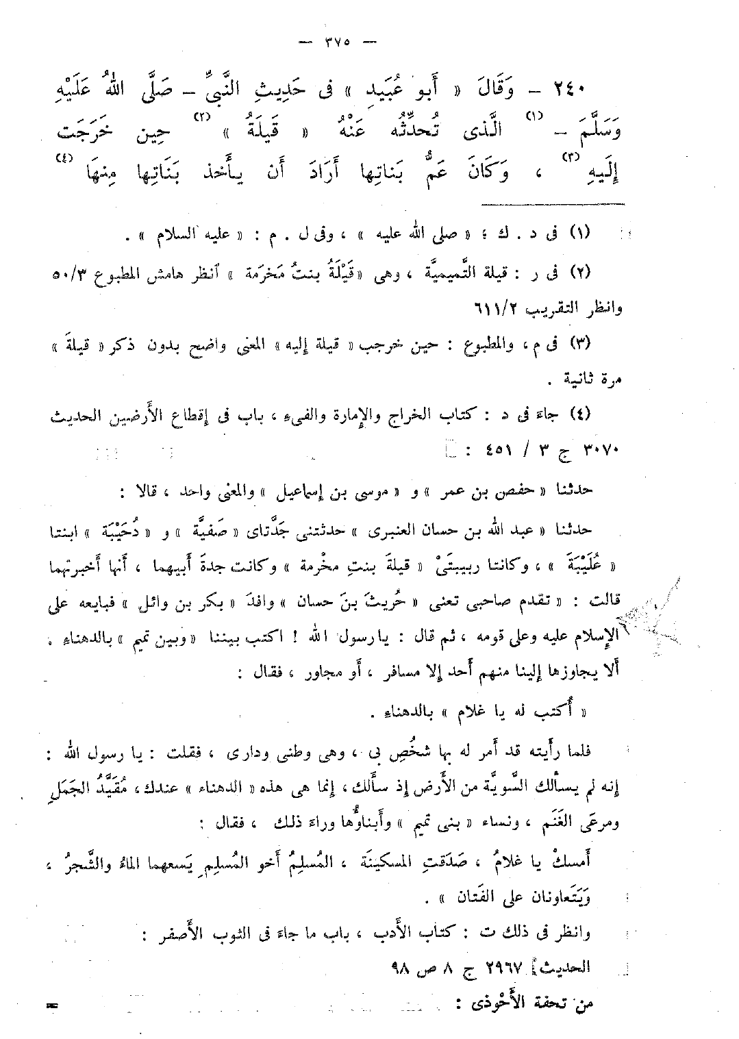 240 - وقال "أبو عبيد" فى حديث النَّبىِّ -صلَّى الله عليه وسلَّم- الذى تحدِّثه عنه "قيلة" حين خرجت إليه، وكان عم بناتها أراد أن يأخذ بناتها منها