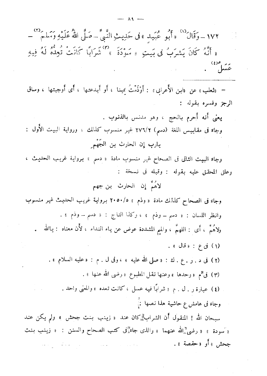 172 - وقال "أبو عبيدٍ" فى حديث النبىُّ -صلَّى الله عليه وسلم- "أنه كان يشرب فى بيت "سودة" شرابًا كانت تعده له فيه عسلٌ.