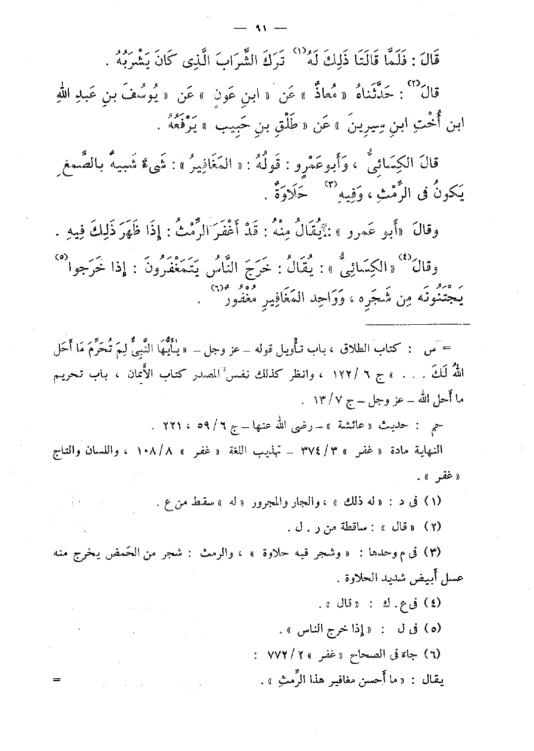 قال الكسائىُّ، وأبو عمرٍو: قوله: "المغافير": شيءٌ شبيهٌ بالصَّمغ يكون فى الرّمث، وفيه حلاوةٌ.